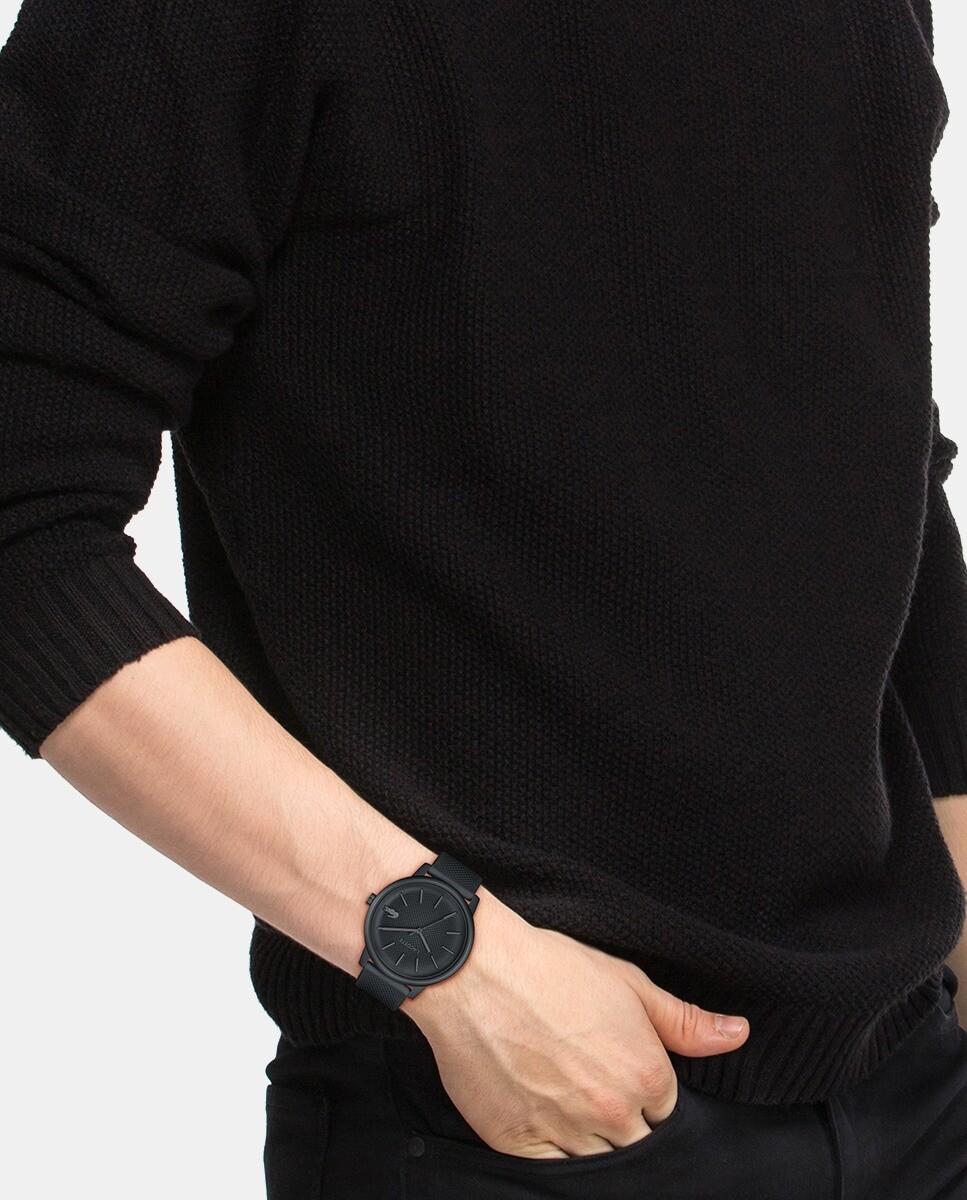 Кварцевые часы с 3 стрелками, корпус из полуматового черного алюминия, черный циферблат с деталями из мелкого пике на концах и индикаторами. Черный силиконовый ремешок с текстурой мелкого пике.