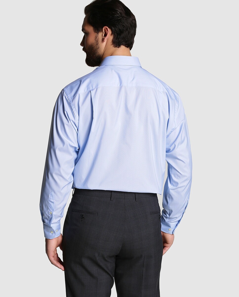 Филевая рубашка с длинными рукавами синего цвета. Имеет английский воротник и закругленные манжеты.