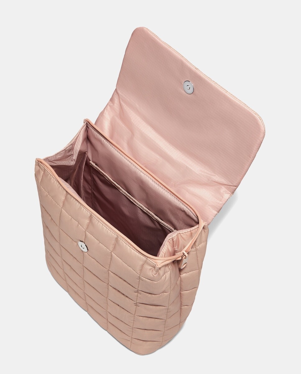 Рюкзак из бежевого нейлона с набивкой и отделкой UGG на клапане. магнитное закрытие. Имеет короткую верхнюю ручку. двойная задняя ручка.