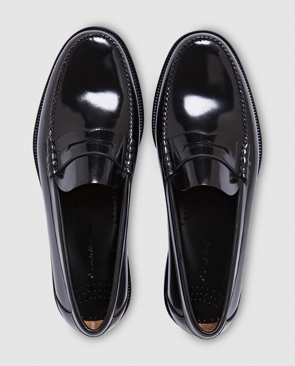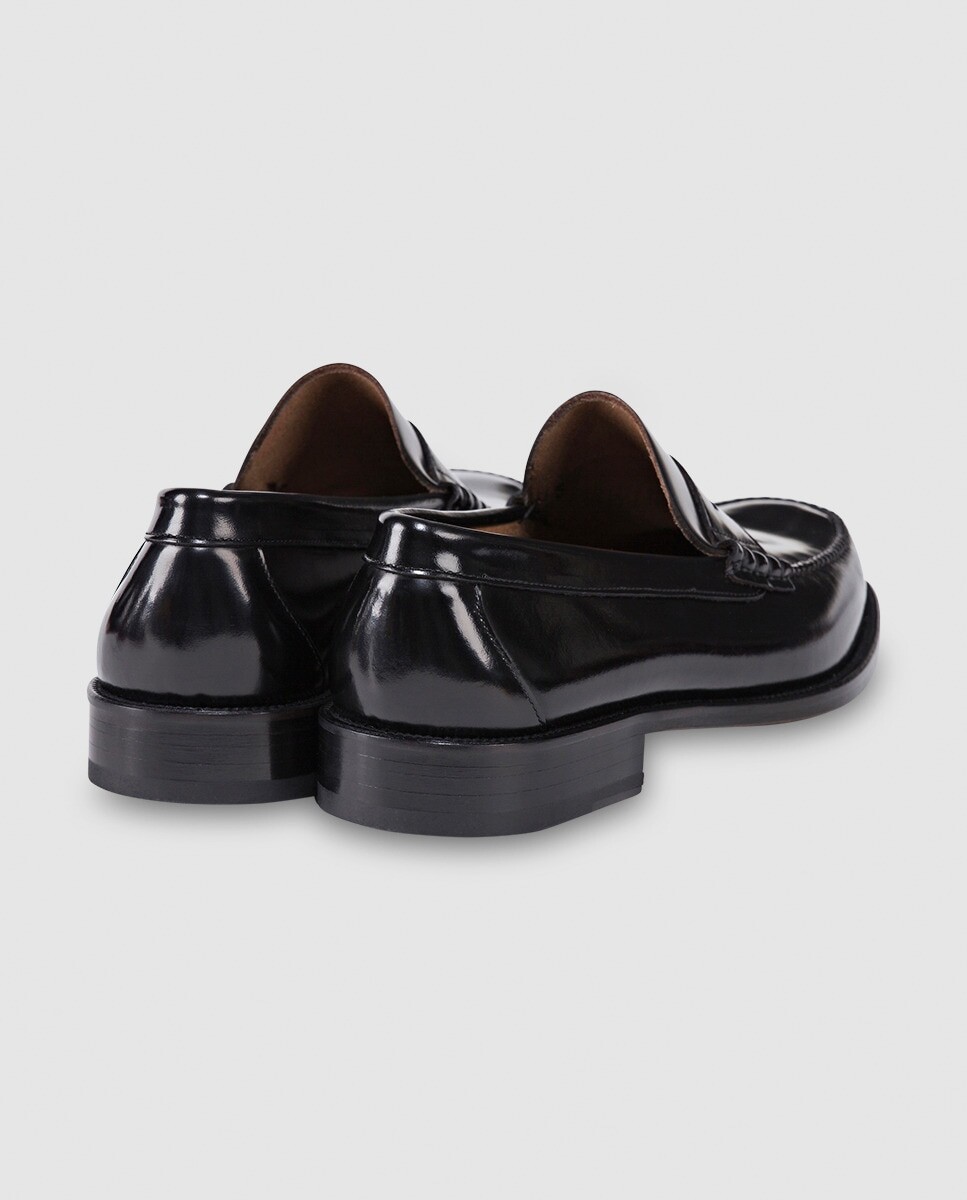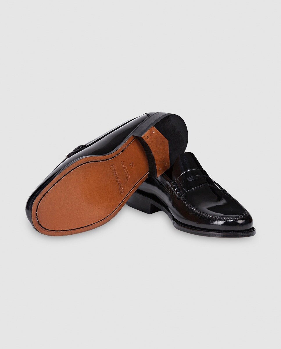 Мокасины из черной кожи с пришитыми вручную деталями на колодке. У них кожаная подошва. У них каблук высотой 2 см.