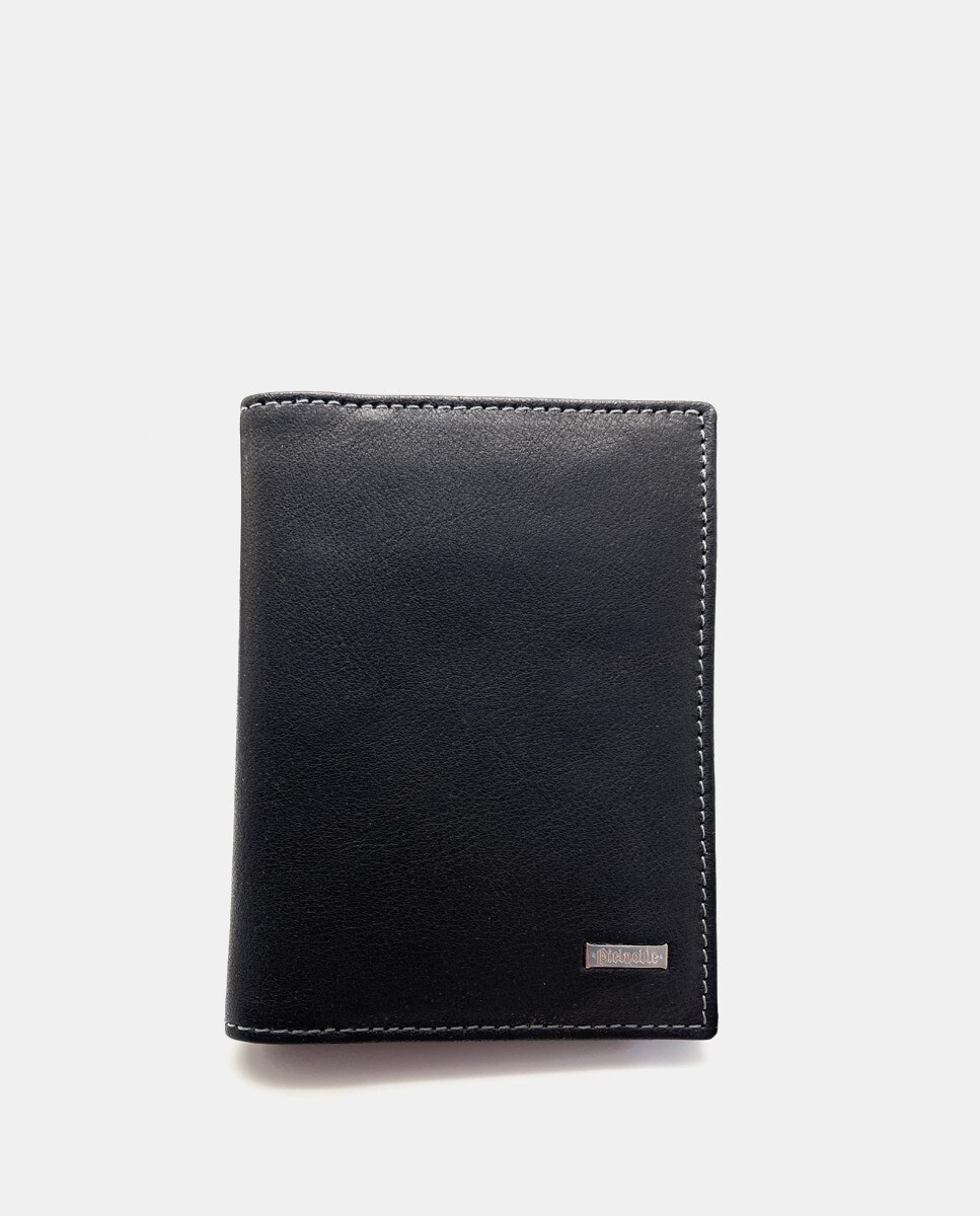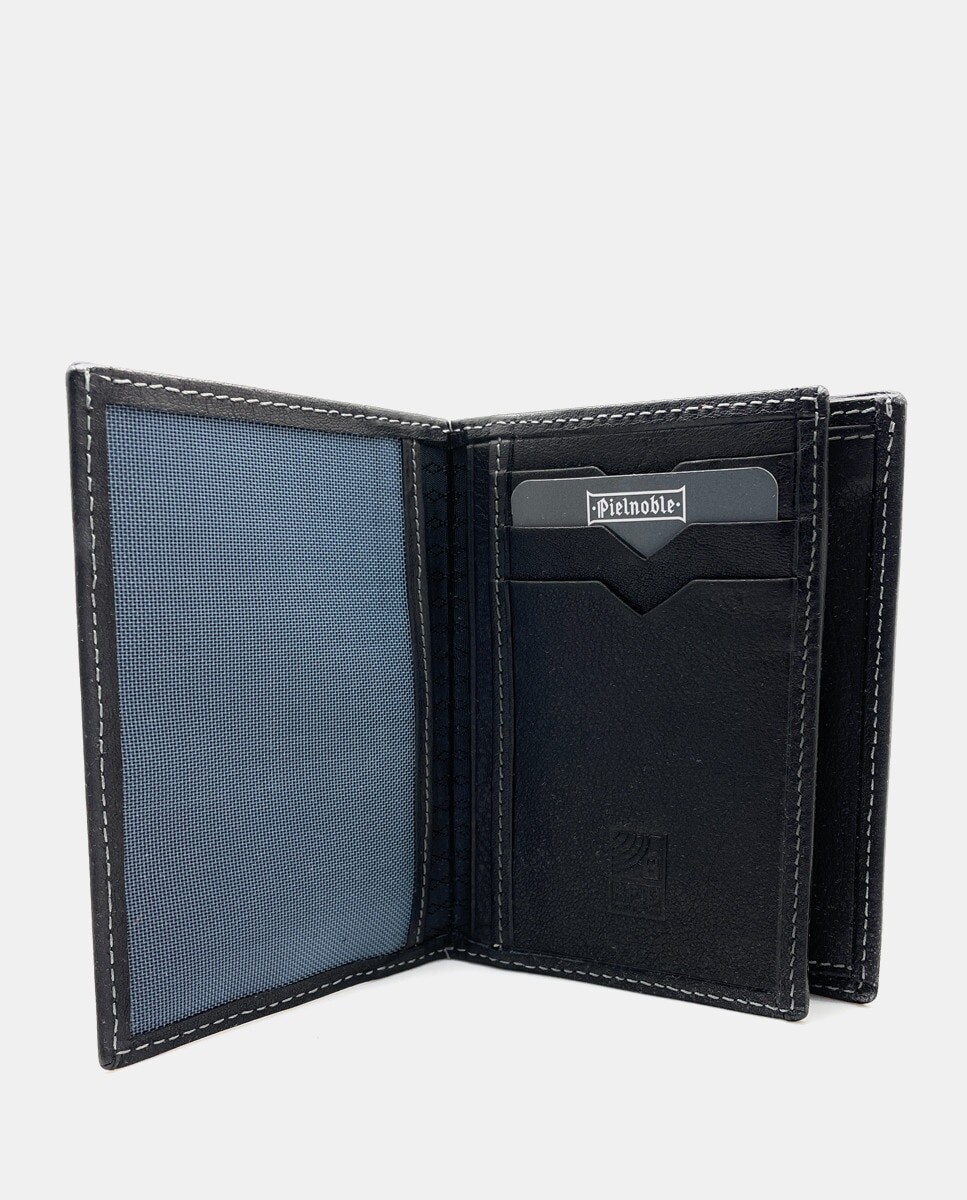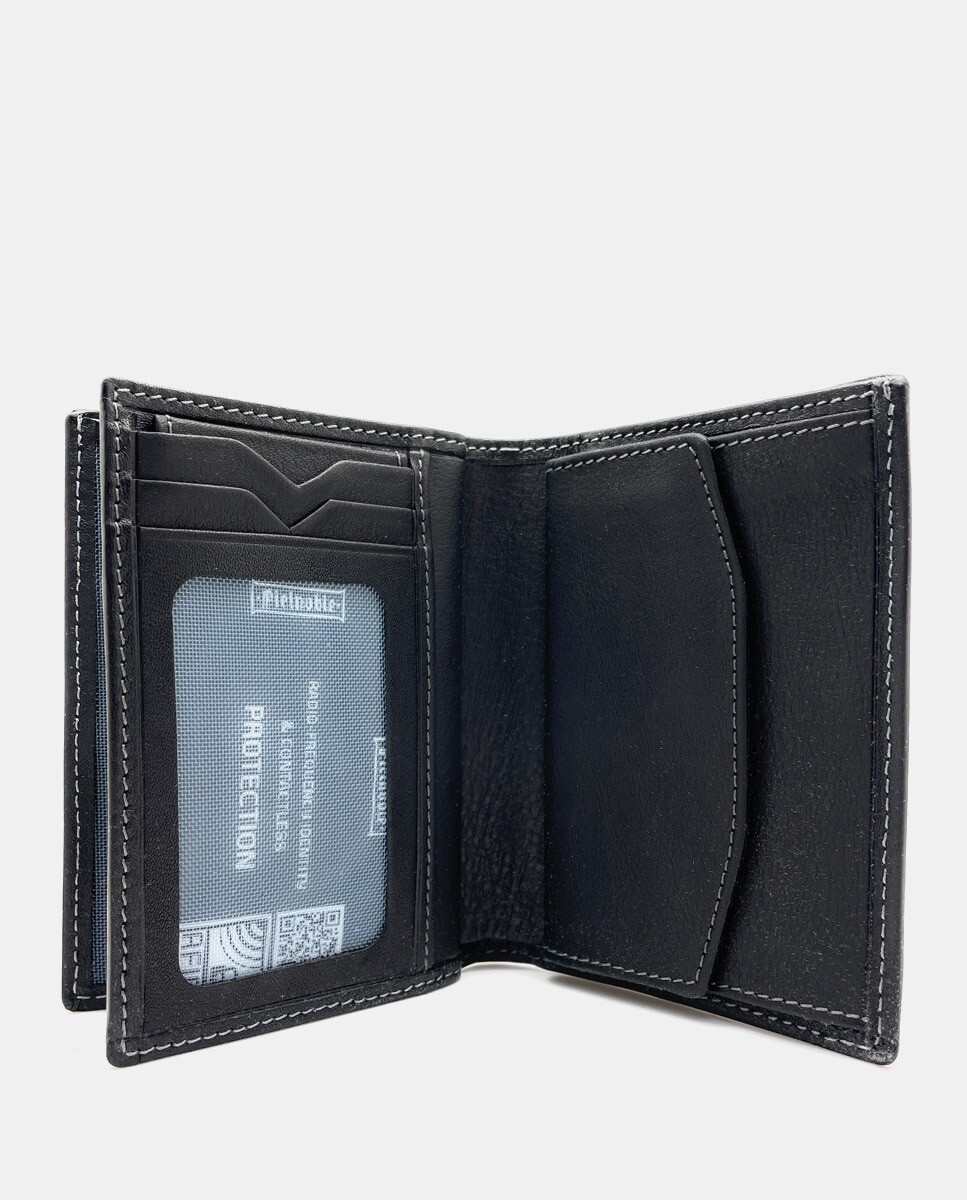 Черный кожаный кошелек с шестью отделениями для карт, карманом для монет и двойным кошельком. Встроенная система защиты от копирования карт.