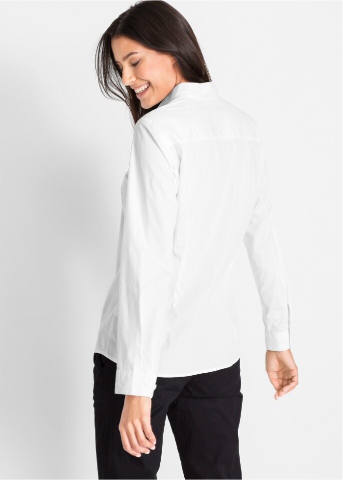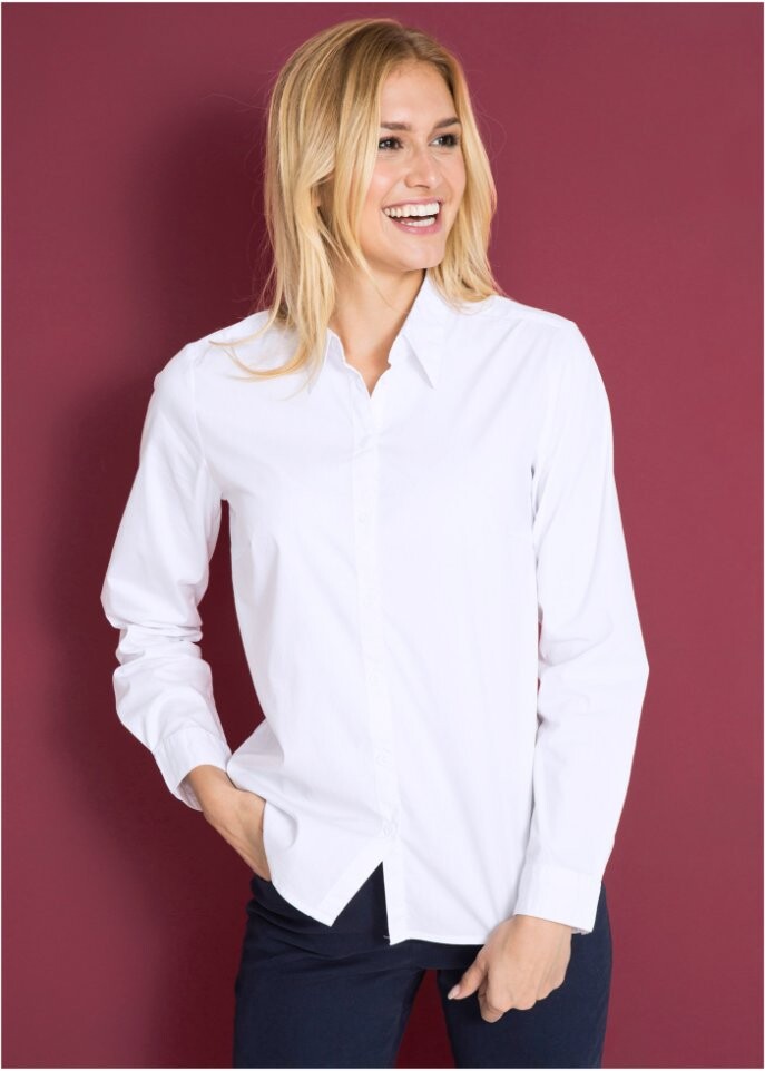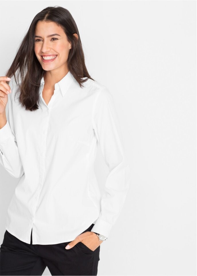 Эта вневременная блузка из текущей коллекции bpc впечатляет модным облегающим кроем и красивыми деталями. Прекрасно сочетается со спортивными нарядами с джинсами и брюками чинос, а также с шикарными сочетаниями с брюками и юбками.Мягкий эластичный материал обеспечивает удобную посадку и идеальную посадку.Красивый воротник рубашки и тонкая планка на пуговицах, а также регулируемые манжеты придают блузке сдержанно-элегантный вид. Завершает модель слегка закругленный низ.