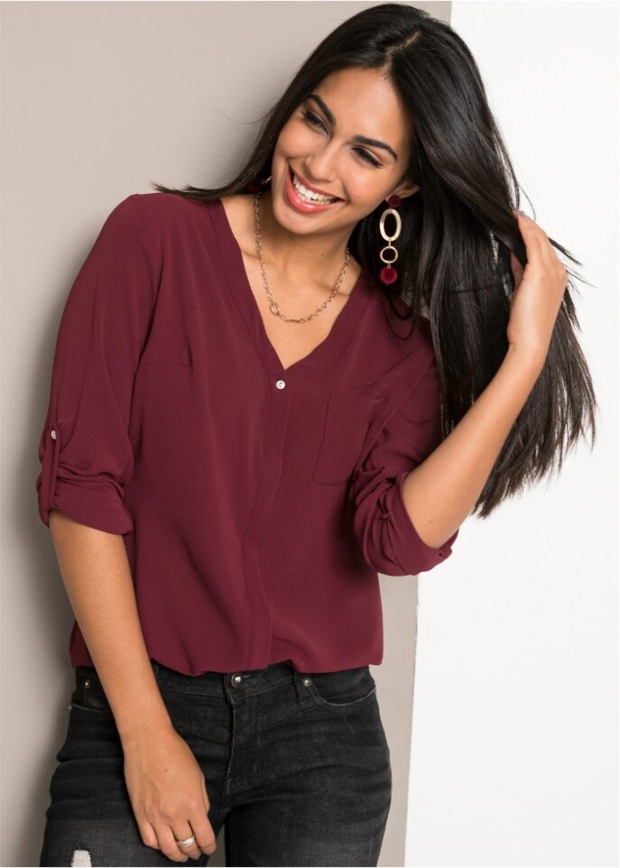 Блузка с длинными рукавами от Bodyflirt подойдет для офиса и отдыха. Он отличается утонченным дизайном с накладным нагрудным карманом и V-образным вырезом. Для модного образа рукава можно подвернуть и застегнуть на пуговицу и петлю.Эффектная модель восхищает мягким, струящимся, слегка прозрачным крепом и потайной планкой на пуговицах.
