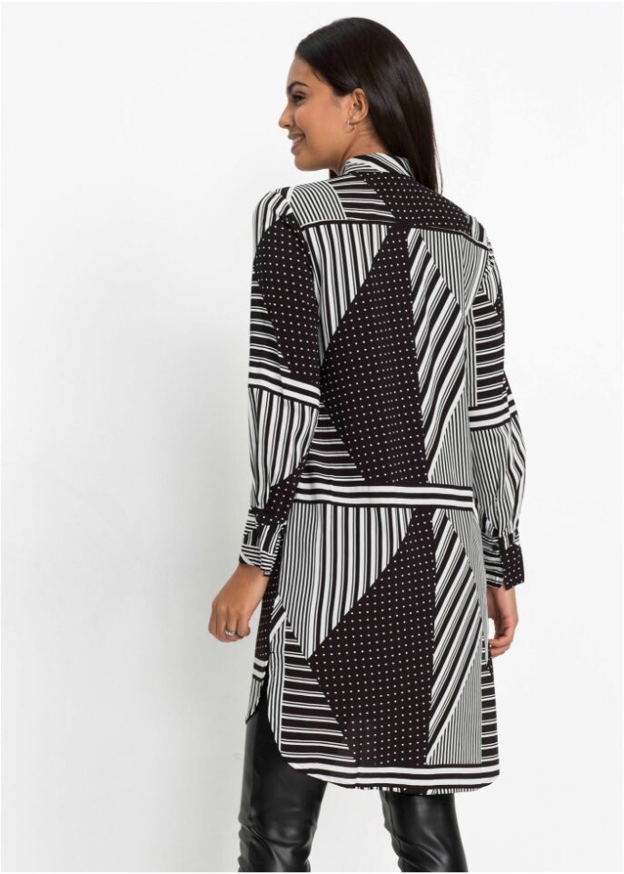 Четкий силуэт этой длинной блузки от Bodyflirt создает стильный образ. Модель прямого кроя имеет воротник Kent, планку на пуговицах и манжеты, придающие ей классический вид. Блузка длиной до колена впечатляет во многих сочетаниях. Привлекательный повседневный шик можно создать с помощью джинсов стрейч 7/8 и ботильонов. Вечером леггинсы из искусственной кожи и туфли на высоком каблуке выгодно подчеркнут длинную блузку.