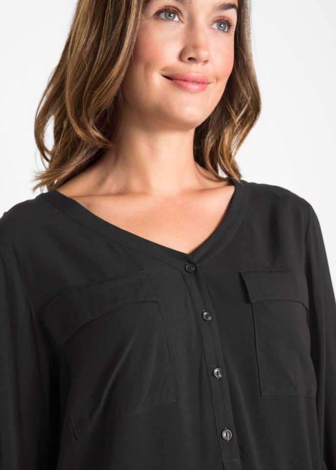 Скрытая вискозная блузка с длинными рукавами от bpc льстит обладательнице и обеспечивает красивый внешний вид. Рукава можно подвернуть и закрыть планкой на пуговице. Длинная модель со слегка закругленным краем облегает низ и скрывает небольшие изгибы. V-образный вырез красиво подчеркнут короткой планкой на пуговицах до середины, а накладной нагрудный карман спереди подчеркивает непринужденный дизайн.В сочетании с джинсами пастельных тонов и балетками женщины смогут надеть свой любимый наряд в наступающем сезоне.