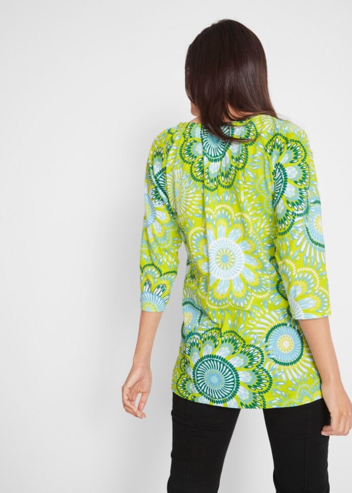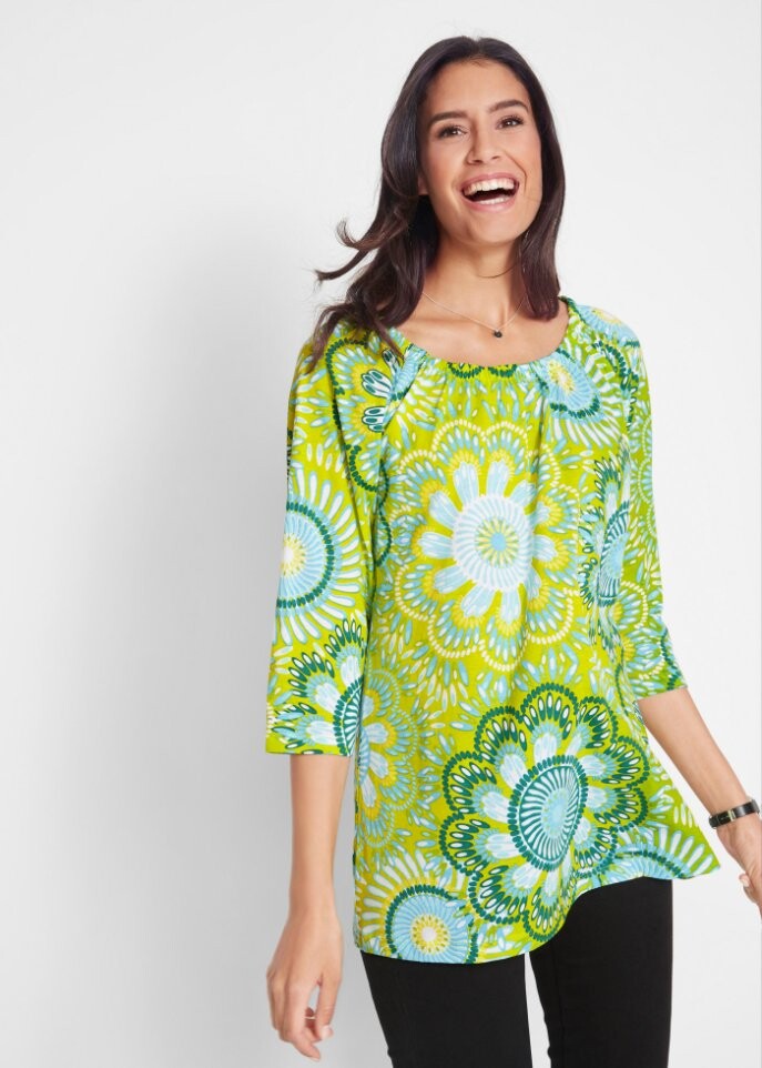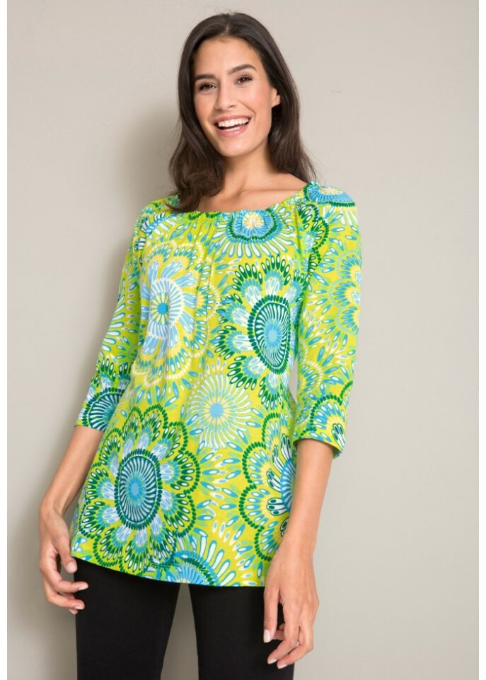 Благодаря красивой посадке рубашка с рукавами 3/4 прекрасно подчеркивает силуэт и удобна в ношении. Топ от бренда bpc имеет скрывающий А-образный крой и придает образу воздушность и легкость. Удобная форма делает модель универсальной для повседневного ношения. Круглый вырез топа слегка присборен резинкой.В сочетании с удобными джинсами женщина выглядит превосходно одетой.