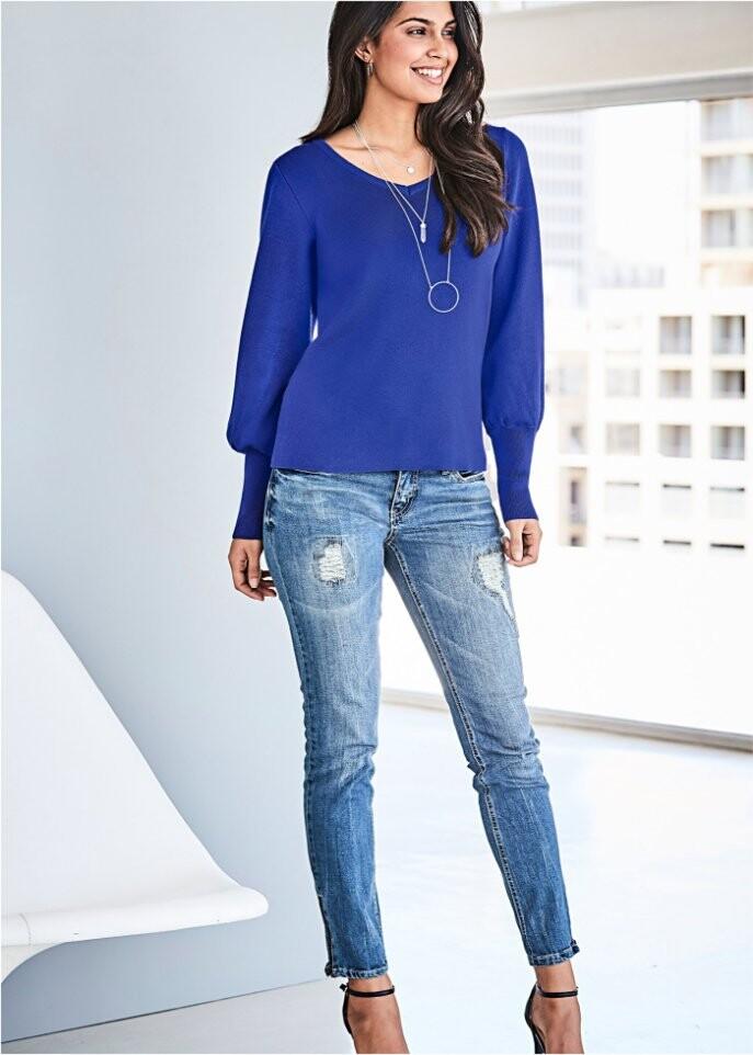 Элегантный или повседневный, этот привлекательный свитер от бренда Bodyflirt можно комбинировать по-разному, и он отлично привлечет внимание. Эффектный свитер имеет широкие рукава-фонарики, которые плотно сужаются к запястью и заканчиваются широкой манжетой. Глубокий V-образный вырез придает привлекательный вид свитеру, закрывающему бедра, с объемными рукавами.