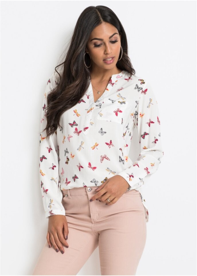 Эта блузка с принтом по всей поверхности от Bodyflirt отличается женственной харизмой. Романтический принт бабочек в привлекательных тонах придает модели феерический шик. Особенно изысканно смотрится V-образный вырез с короткой планкой на пуговицах.Задняя часть очаровательной блузки из тонкоструящегося материала скроена немного длиннее передней части. Слегка закругленный низ, небольшие боковые разрезы и накладной нагрудный карман — еще одни красивые детали.