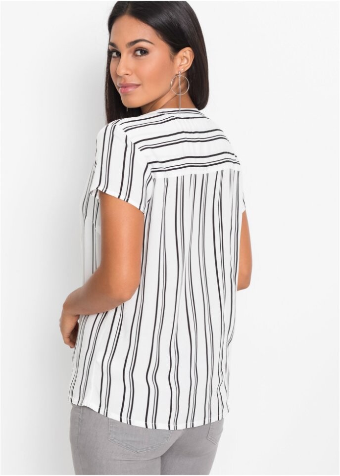 Эта очаровательная блузка с короткими рукавами отличается стильным дизайном, модным воротником-хенли, изысканным V-образным вырезом и видимой планкой с пуговицами спереди. Топ от Bodyflirt выглядит очень женственно благодаря слегка облегающему фигуру прямому крою и мягкой струящейся ткани. Неброские акценты этой универсальной блузки — декоративная контрастная кокетка на плечах и отделка воротника.