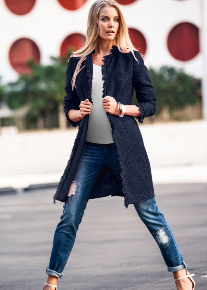 Этот длинный пиджак от Bodyflirt идеально подойдет для особых нарядов. Бахрома проходит вдоль пиджака и манжет, придавая ему поразительный шарм. Шкаф для блейзера застегивается на два крючка в верхней части. С этой модной вещью модно и стильно смотрится классический джинсовый наряд или образ с платьем и обувью на высоком каблуке.