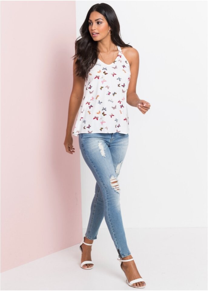Эта красивая блуза-топ от Bodyflirt поражает своим женственным очарованием. Оно имеет изысканный А-образный крой и плавно обтекает фигуру. Модель имеет изящный V-образный вырез спереди и перекрещенные бретели сзади. Еще одна особенность топа-блузки А-силуэта – красивый принт по всей поверхности. Очаровательное сочетание наряда получится с джинсами скинни и сандалиями или туфлями.