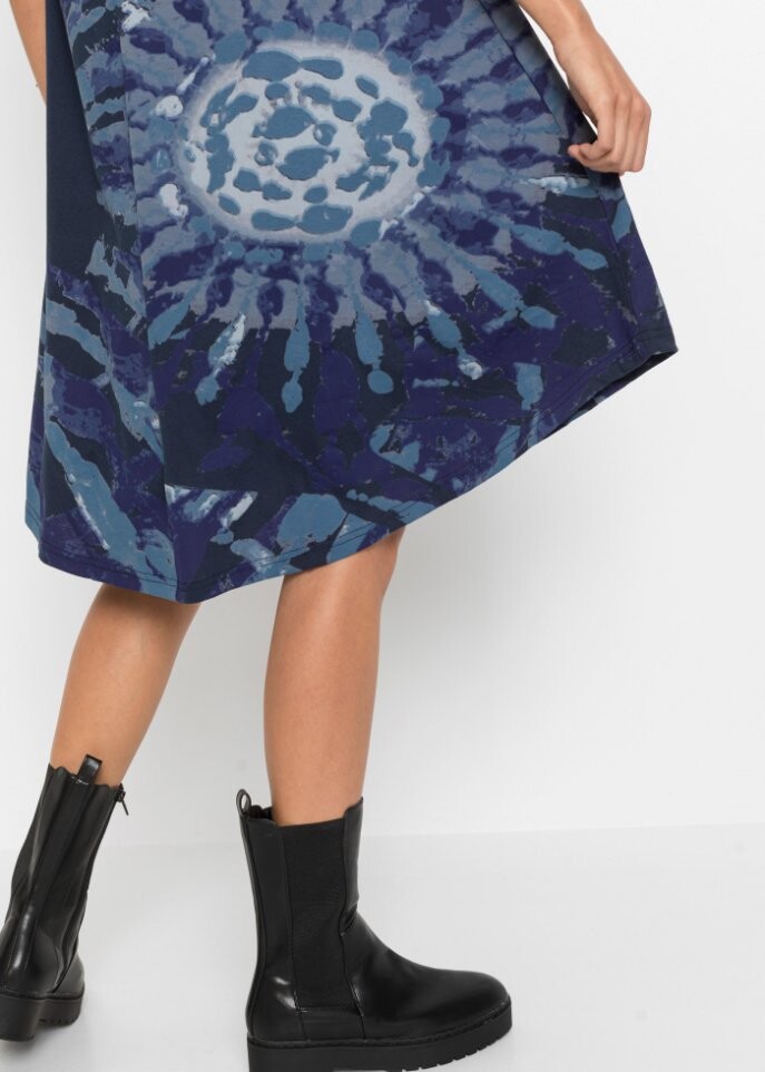 Женственный А-образный силуэт изящно подчеркивает это модное платье. Широкая свободная модель без рукавов в стильном богемном образе впечатляет выразительным принтом по всей поверхности и глубоким V-образным вырезом спереди и сзади. Узкие бретели эластичны сзади и могут индивидуально регулироваться по длине. Модное трикотажное платье с узором тай-дай также отлично смотрится с рубашкой или топом в более прохладную погоду.