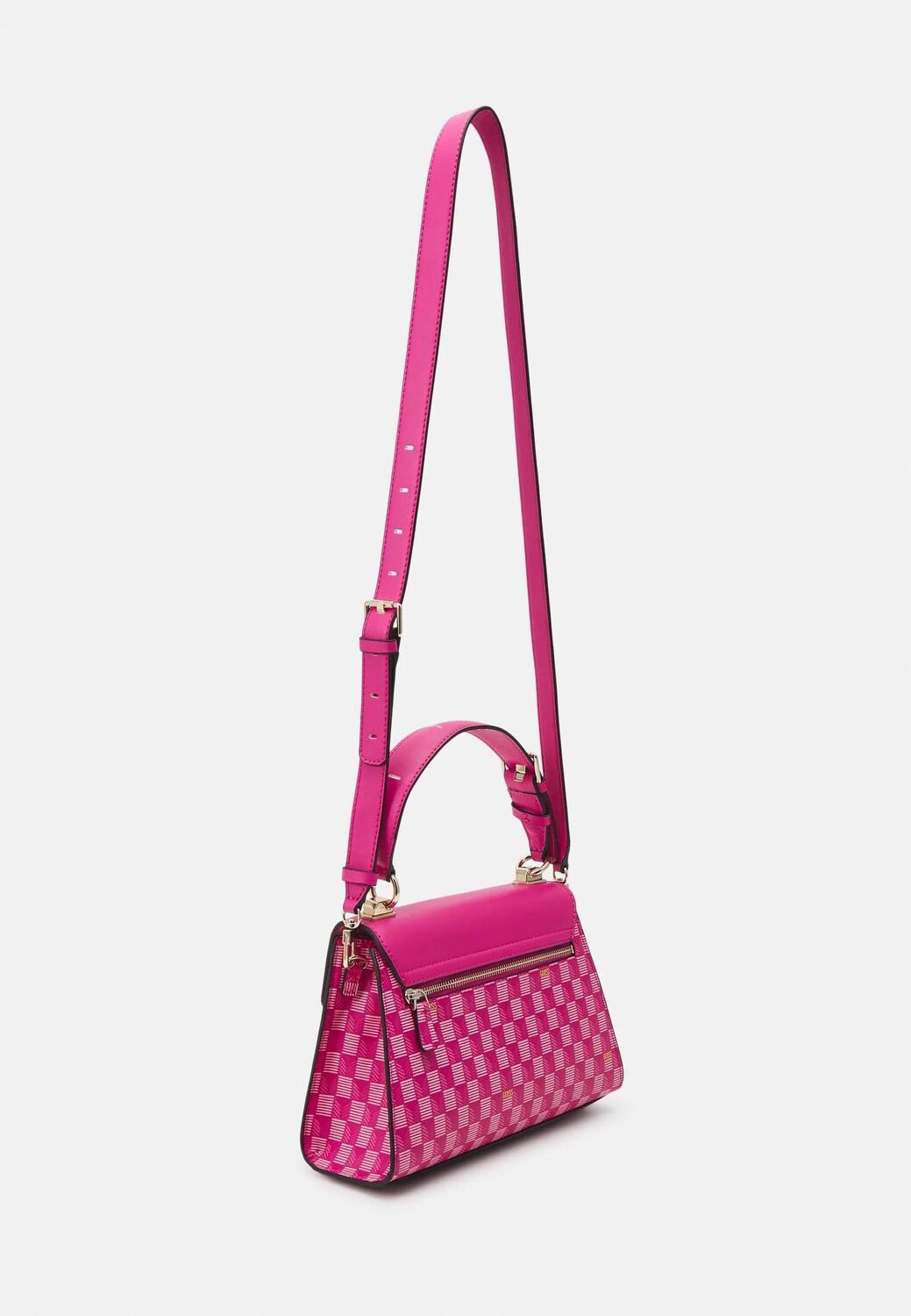 Сумка из искусственной кожи с короткой ручкой и регулируемым ремнем через плечо. Клапан сумки застегивается на магнитные кнопки. Имеет одно отделение, внутренний карман на молнии. Фурнитура из металла желтого цвета. Буквенный логотип спереди.