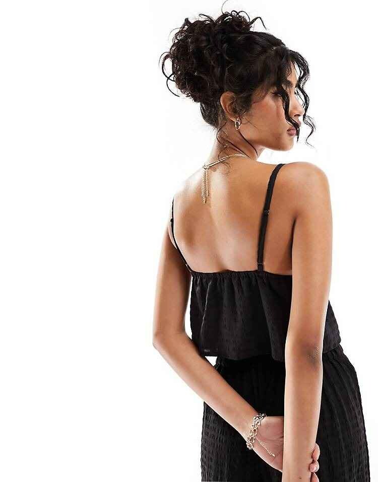 Черный топ из легкой рельефной ткани с завязкой спереди.