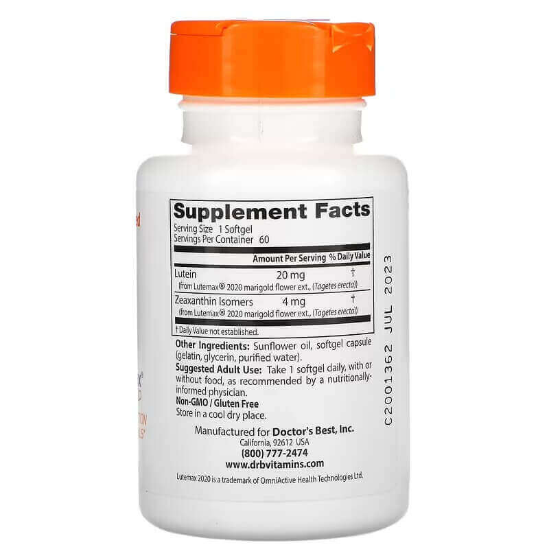 Doctor's Best Lutein with Lutemax 2020 содержит хорошо изученное оптимальное соотношение лютеина и зеаксантина, помогающее защитить ваши глаза от вредного синего света высокой энергии в повседневных условиях, включая большинство цифровых экранов, солнечный свет и внутреннее освещение.