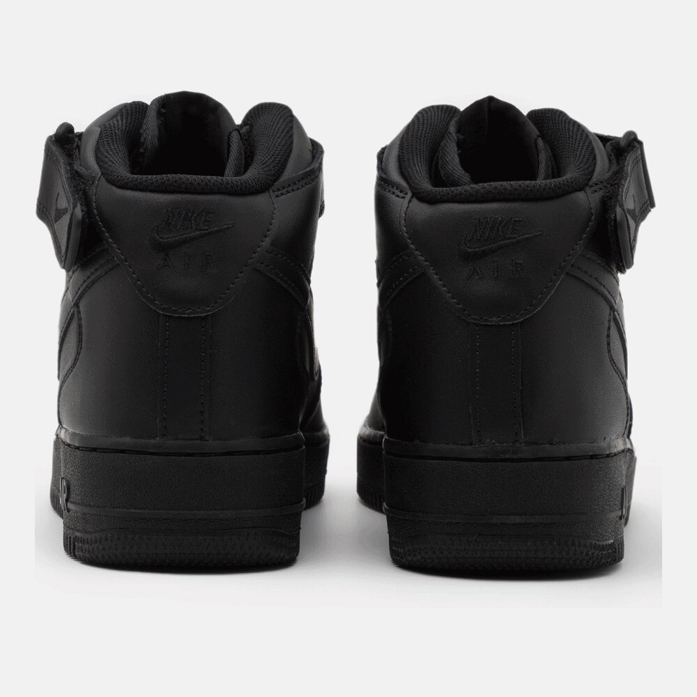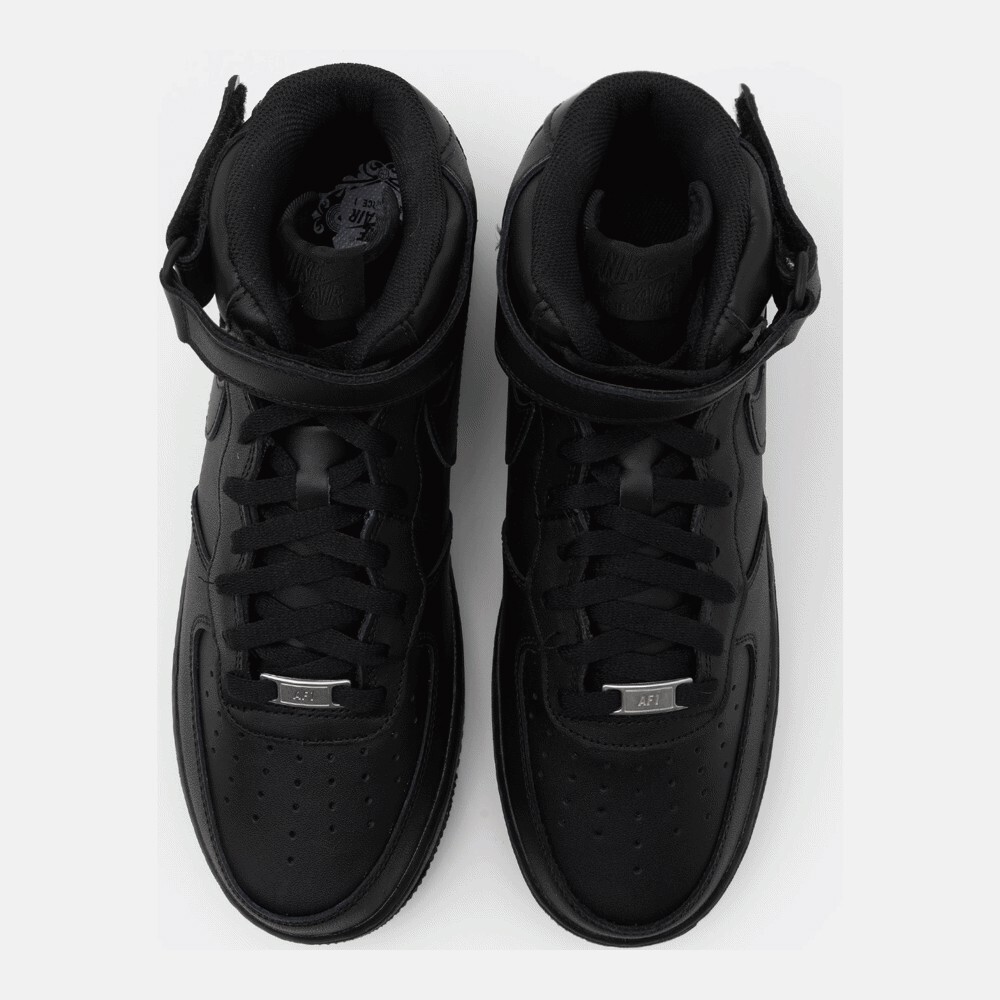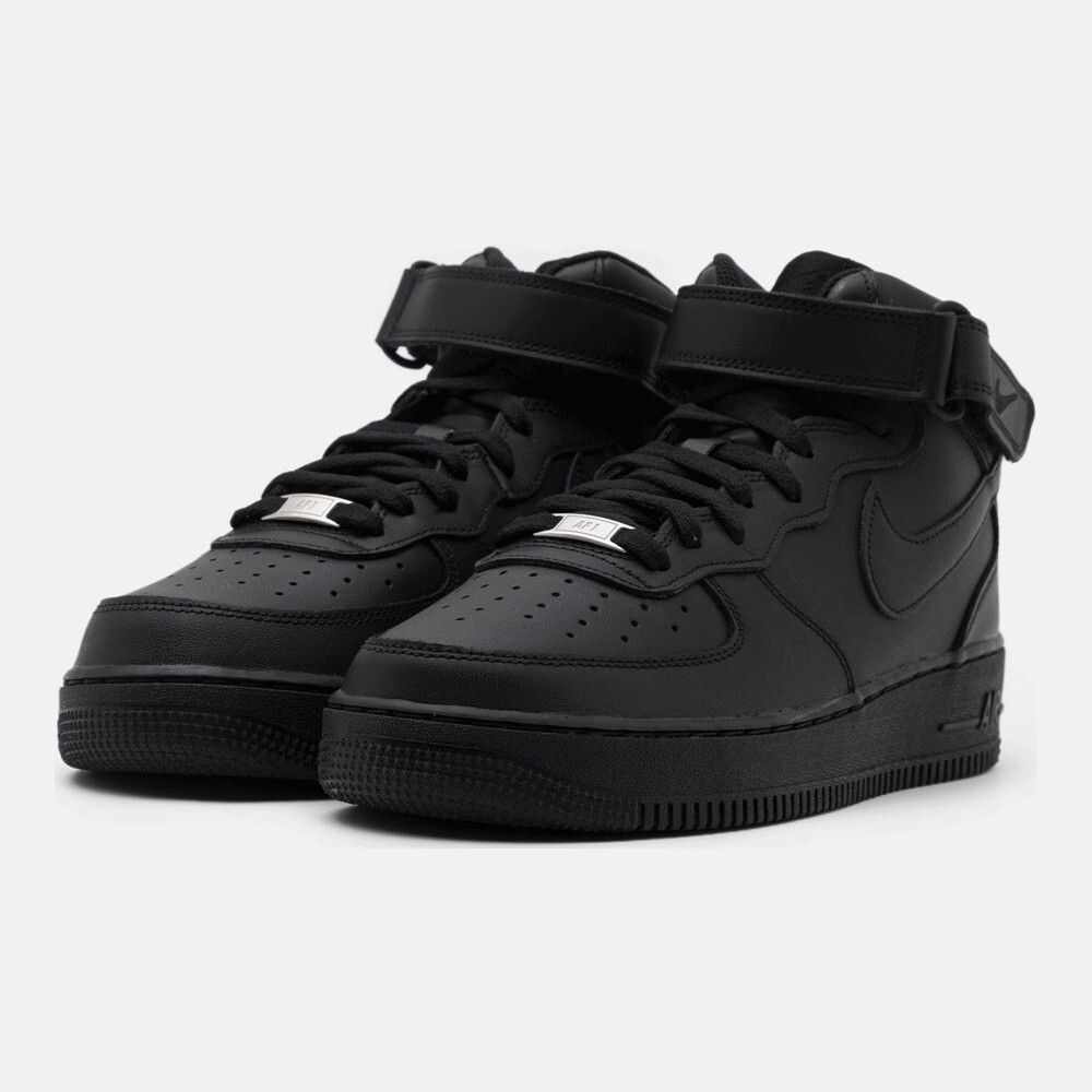 Модель Air Force 1, изначально разработанная Брюсом Килгором и выпущенная в 1982 году, стала первой баскетбольной обувью с амортизацией Nike Air. Модель AF1 Mid имеет полностью черный кожаный верх с ремешком через верх для индивидуальной посадки. Классические детали AF1 сохранились, включая сцепление в точке поворота и встроенный Nike Air в межподошву.
