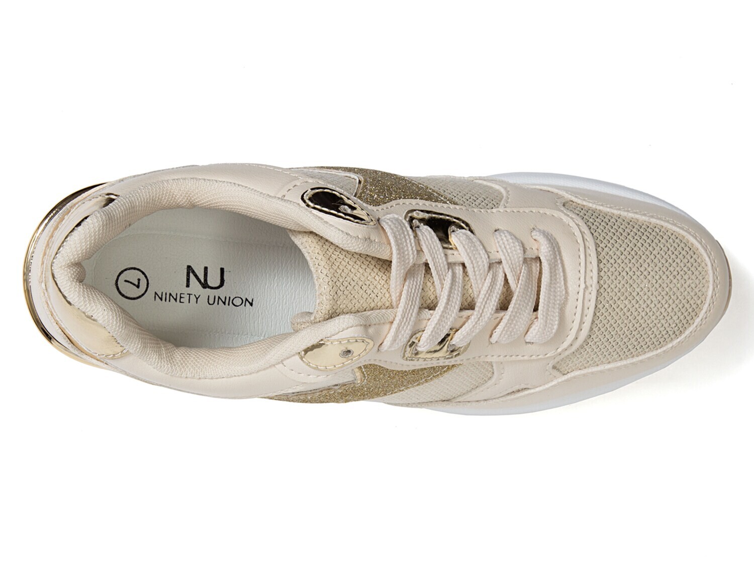 Блестящий и спортивный одновременно; Кроссовки на танкетке Ninety Union Relax мгновенно привлекут внимание. Блестящая ткань контрастирует с однотонной синтетикой этих кроссовок на шнуровке, дополненных мягкой стелькой для комфорта в течение всего дня.