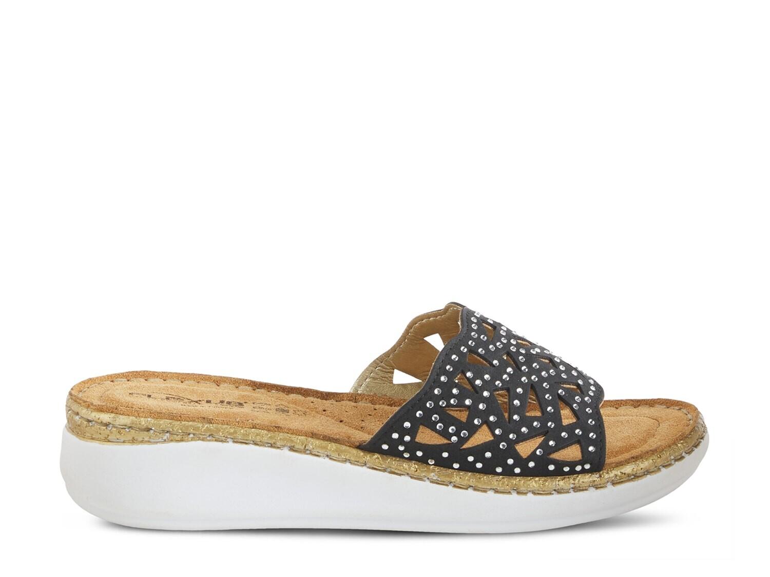 Сандалии Windom на танкетке от Flexus от Spring Step привнесут нотку в ваш летний образ. Геометрические вырезы и акценты из стразов привлекают все внимание к сандалиям-шлепанцам, а подошва на танкетке на платформе повышает комфорт при ходьбе.