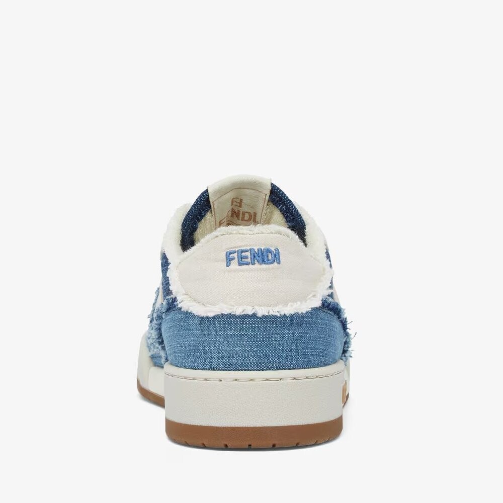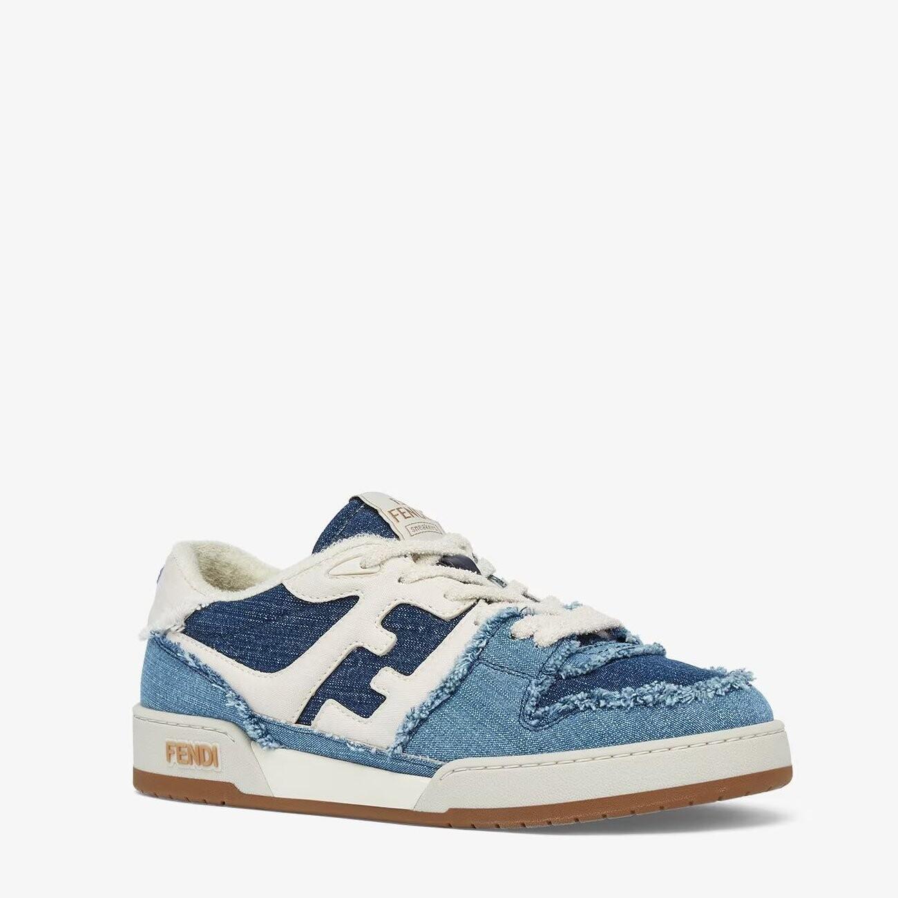 Низкие сникеры Fendi Match на шнуровке. Модель из денима темно-синего, светлого и белого цветов. Кромки с бахромой ручной работы. Подошва из каучука с надписью Fendi с одной стороны.