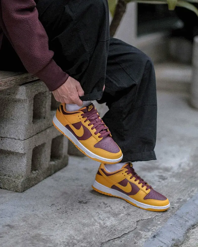 Благодаря своему дизайну и цветовому решению, кроссовки выглядят стильно и модно, что делает их отличным выбором для повседневной носки и спортивной активности. Nike Dunk Low «Arizona State» оформлены в знакомую расцветку спортивных команд «Sun Devils» из Университета Аризоны. Темная, бордовая основа сочетается с яркими желтыми накладками, «свушем» и подкладкой. Ниже видим белую межподошву и солнечную желтую аутсоль.