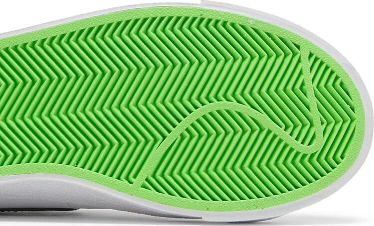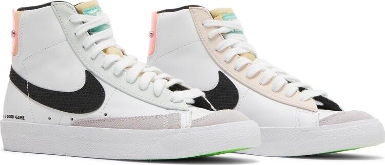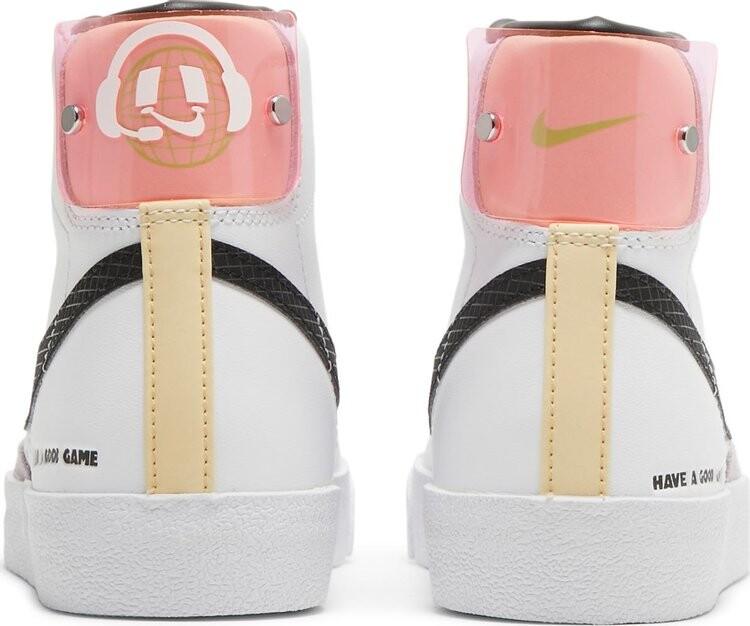Кроссовки Nike Blazer Mid Have a Good Game имеют гладкую белую кожаную основу с тиснением «Have A Good Game» на боковой стороне, а также этикетку на язычке нейтрального тона с надписью «Game On/Team Up». Они также имеют серые замшевые накладки на передней части стопы и белую межподошву поверх зеленой резиновой подошвы.