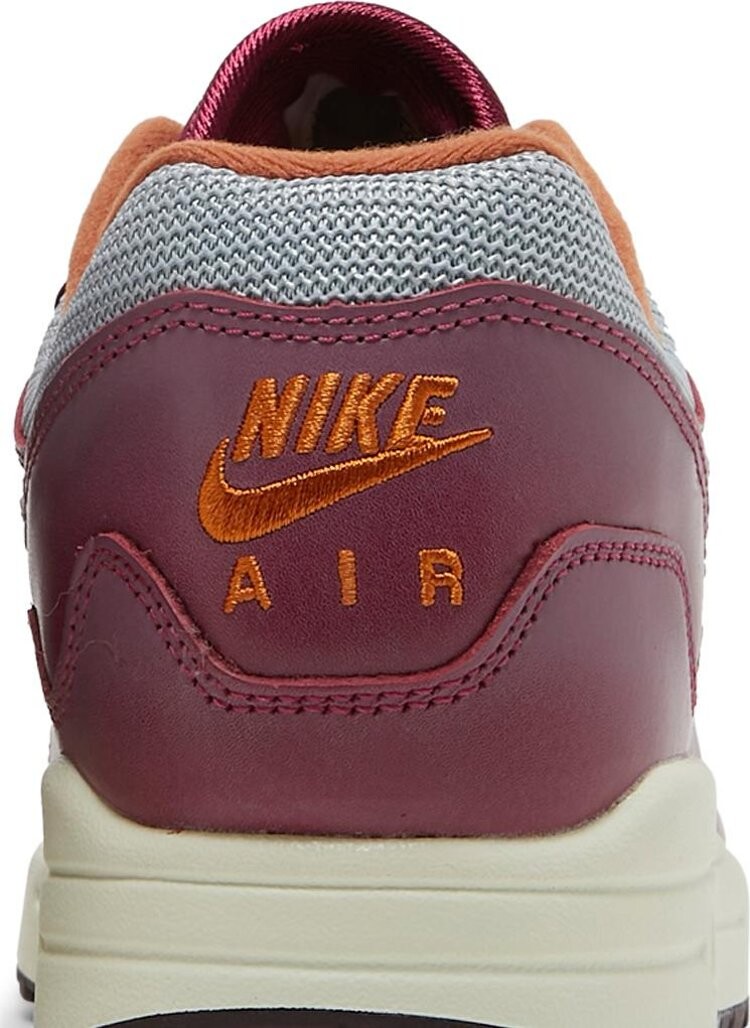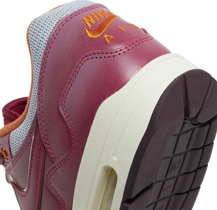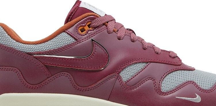 Ремикс винтажных кроссовок 1987 года с версией амстердамского ритейлера — Patta x Nike Air max 1 «Rush Maroon». Верх выполнен из серебристой сетки с контрастными накладками из темно-бордовой кожи, включая волнистый брызговик с вышитым мини-галочкой на боковой стороне. Фирменный знак Nike Air на накладке на пятке имеет оранжевые буквы, которые сочетаются с верхними проушинами и текстильной подкладкой воротника кроссовок. Логотип Patta расположен на плетеном язычке с легкой амортизацией на белоснежной полиуретановой межподошве с видимой вставкой Air, расположенной под пяткой.