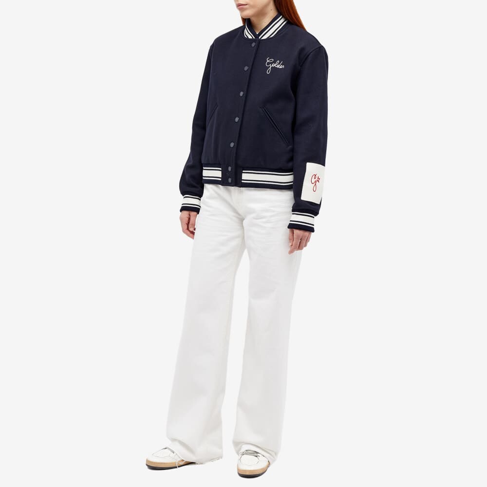 В этой куртке-бомбере Golden Star компания Golden Goose отходит от своей традиционно потертой эстетики. В этом дизайне роскошный дом воплощает ностальгию по Америке. В нем присутствуют все элементы ретро, которые можно ожидать от этого стиля, такие как воротник-стойка и полосатая отделка, и все это с одобрением Golden Goose на груди и рукавах.