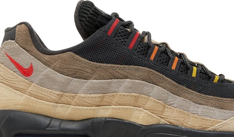 Тонкие топографические образы, вдохновленные человеческим телом, послужили вдохновением для создания Nike Air Max 95 Topographic. Эта обувь Heritage, выполненная в насыщенных землистых тонах, имеет накладки из волнистой коричневой замши с тиснением узора, перекликающегося с топографическими картами. Нейтральный фон пересекают акценты красного, желтого и оранжевого цветов на мини-галочке и петельках. Оптимальная поддержка и комфорт обеспечиваются межподошвой из полиуретана черного цвета с открытыми вставками Max Air под передней частью стопы и пяткой.