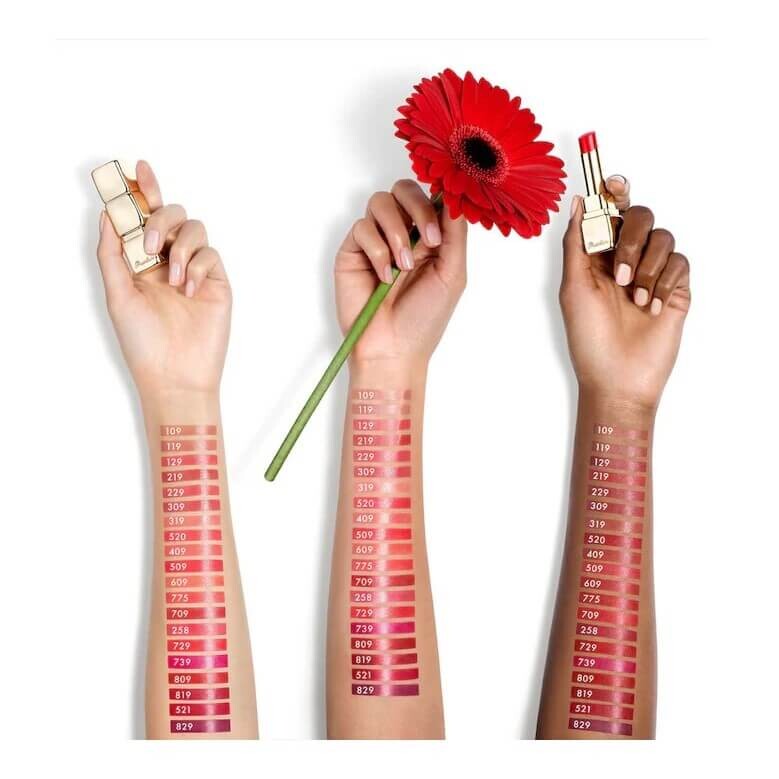 Губная помада на 95 % состоит из натуральных ингредиентов. Guerlain представляет KissKiss Shine Bloom, новую губную помаду, на 95% состоящую из ингредиентов природного происхождения. Формула со сияющим финишем, не ухудшающая чувственность и эффективность. Его исключительная тающая текстура скользит по губам, придавая им восхитительный цвет и водный блеск.