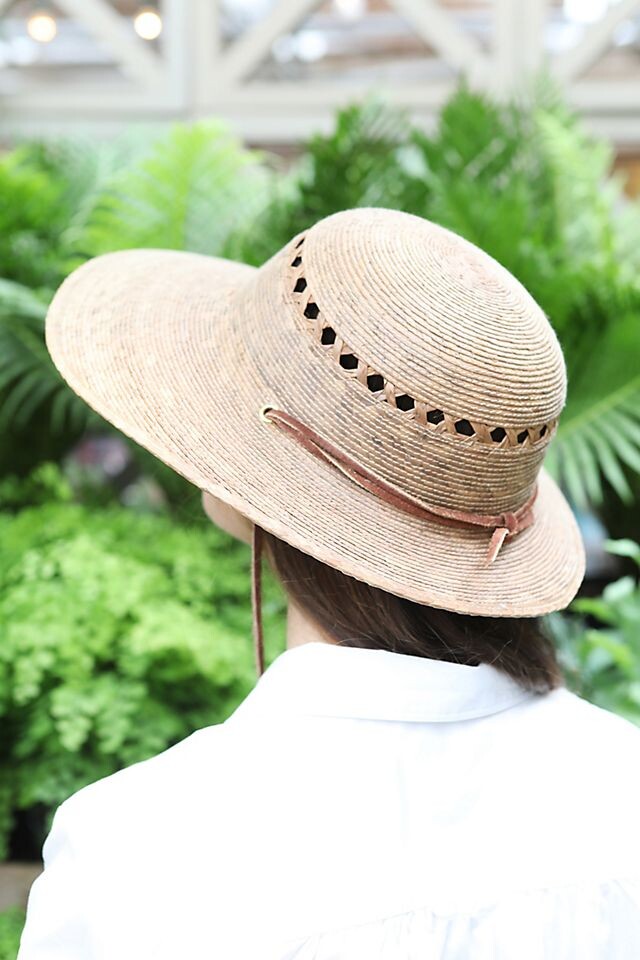 Асимметричные поля делают эту шляпу идеальной для дня, проведенного на солнце. Каждая шляпа соткана вручную из экологически чистых пальмовых волокон и дополнена замшевым ремешком.