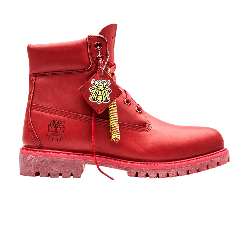 Верх из красной кожи дополнен мягким воротником, анодированной фурнитурой и логотипом Timberland на подошве. язычок и пятка, а также резиновая подошва с выступами в тон. Вышитая бирка Bee Line служит намеком на сотрудничество, а варианты кружева ярко-красного и коричнево-желтого цвета позволяют персонализировать модель.