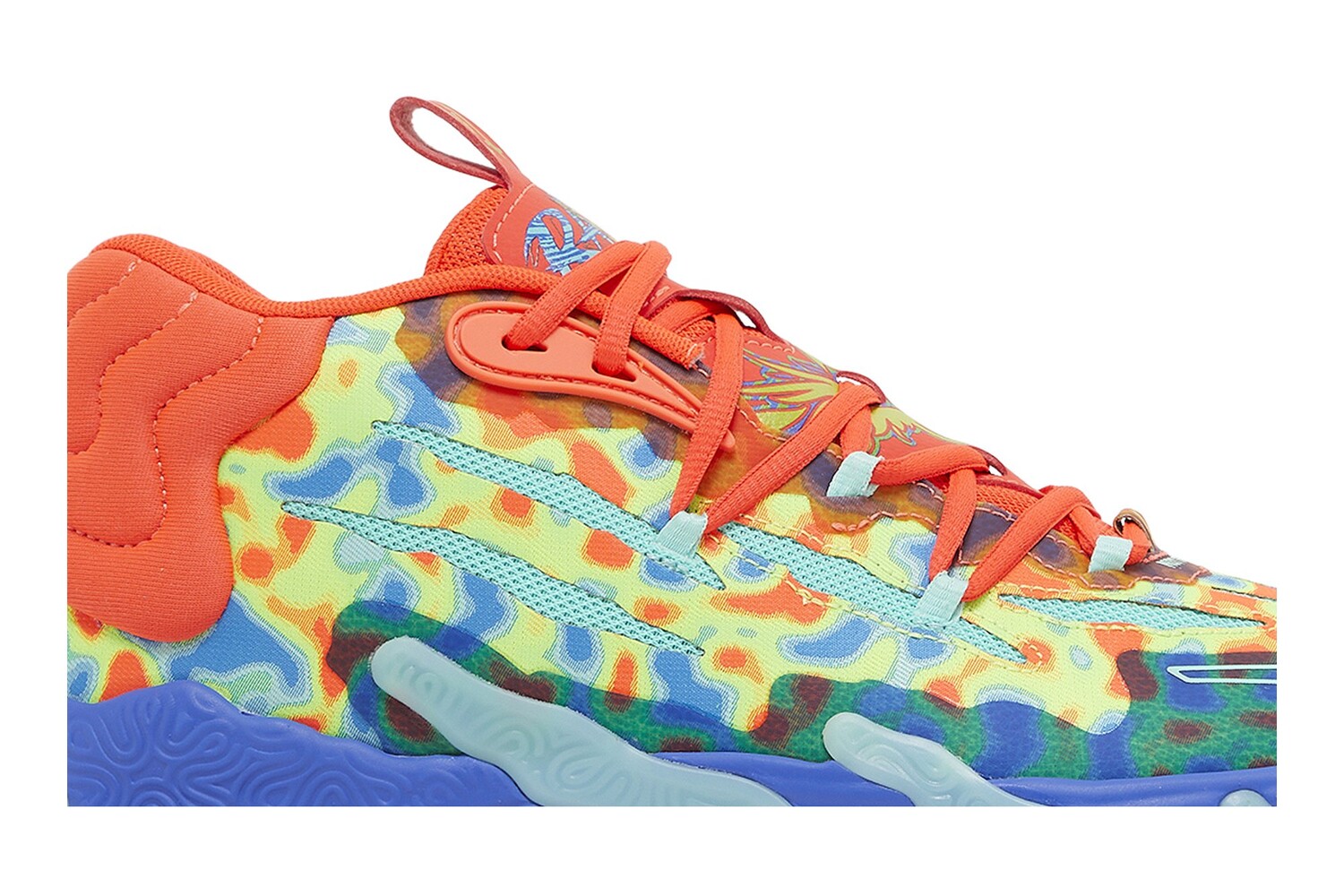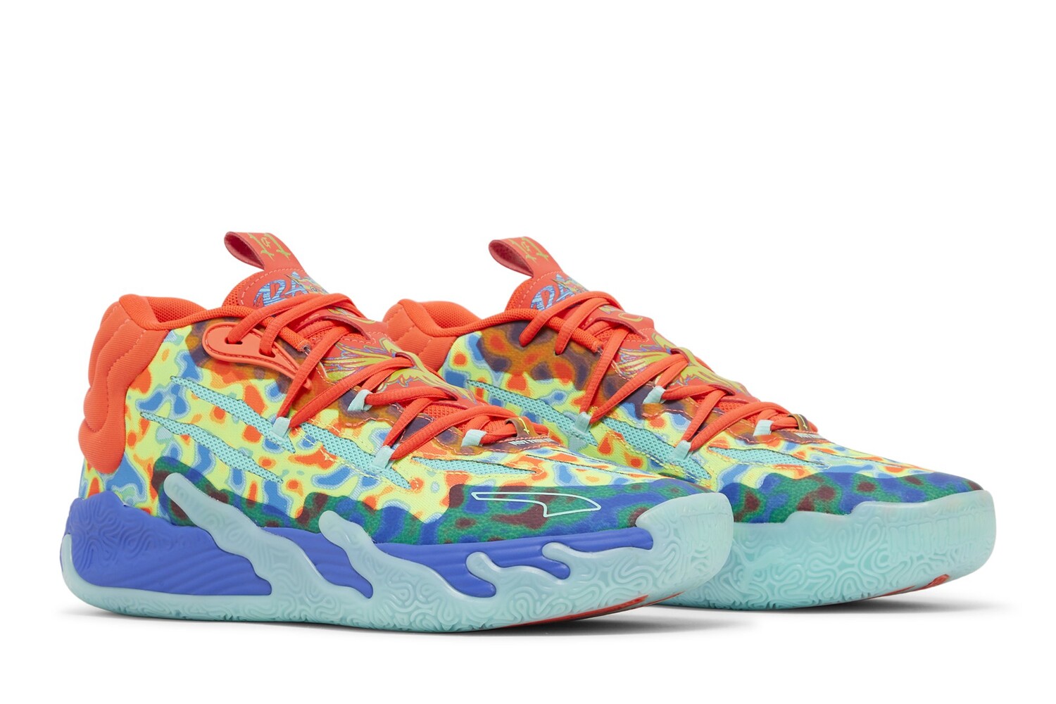 PUMA MB.03 «GutterMelo» представляет собой третью фирменную модель LaMelo Ball в цветовой гамме, выпущенной ограниченным тиражом, разработанной в сотрудничестве с Gutter Cat Gang, самопровозглашенным «подпольным социальным клубом Web3». Верх сочетает в себе искусственную сетку ярко-бирюзового цвета с разноцветными синтетическими накладками синего, зеленого и алого цветов. Последний оттенок повторяется на воротнике, шнурках и язычке с изображением Gutter Cat и логотипом LaMelo «Rare». Креплением кроссовок является межподошва из пеноматериала NITRO Infused, поддерживаемая нескользящей, устойчивой к истиранию резиновой подошвой.
