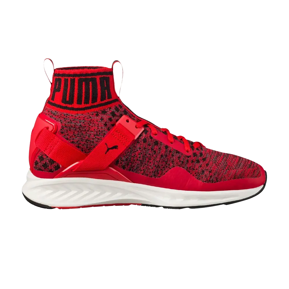 Puma Ignite EvoKnit имеет вязаный верх, похожий на носок, выполненный из смеси красной, черной и серой пряжи. Его завершает воротник до щиколотки с заметным логотипом Puma и двумя петлями для удобства надевания и снятия. Поддерживающий ремешок встроен в проушины, межподошва из пеноматериала Ignite и задник из ТПУ для плотной посадки. На подошве имеется уникальная линия перехода от пятки к носку, имитирующая естественную походку бегуна.