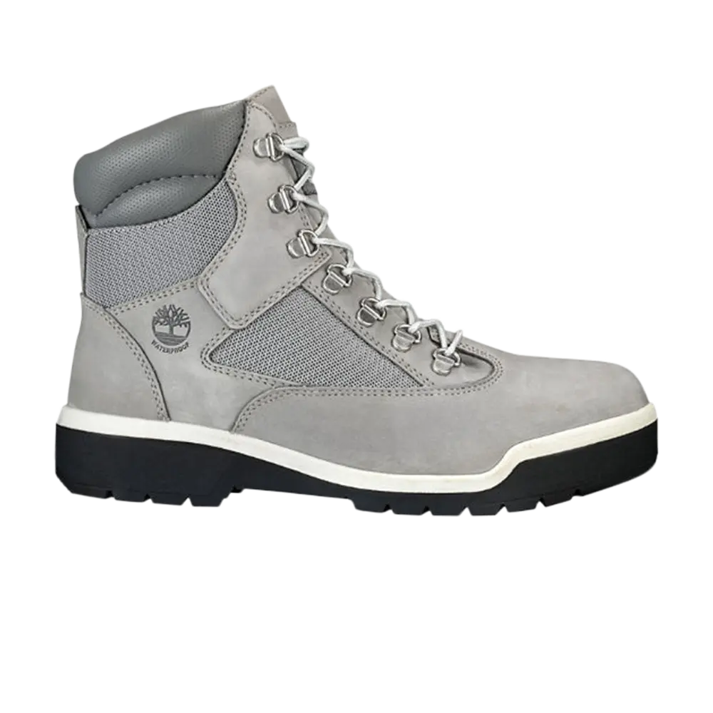 Водонепроницаемые полевые ботинки Timberland 6 Inch были впервые выпущены в 1983 году и сочетают в себе классический стиль рабочих ботинок с современным походным силуэтом. Эта полностью серая версия гибридных ботинок имеет верх из замши и тканевой сетки, усиленный шнуровкой на союзке и нержавеющими D-образными кольцами. Прочная подошва с выступами под ногами на 34 % изготовлена из переработанных материалов.