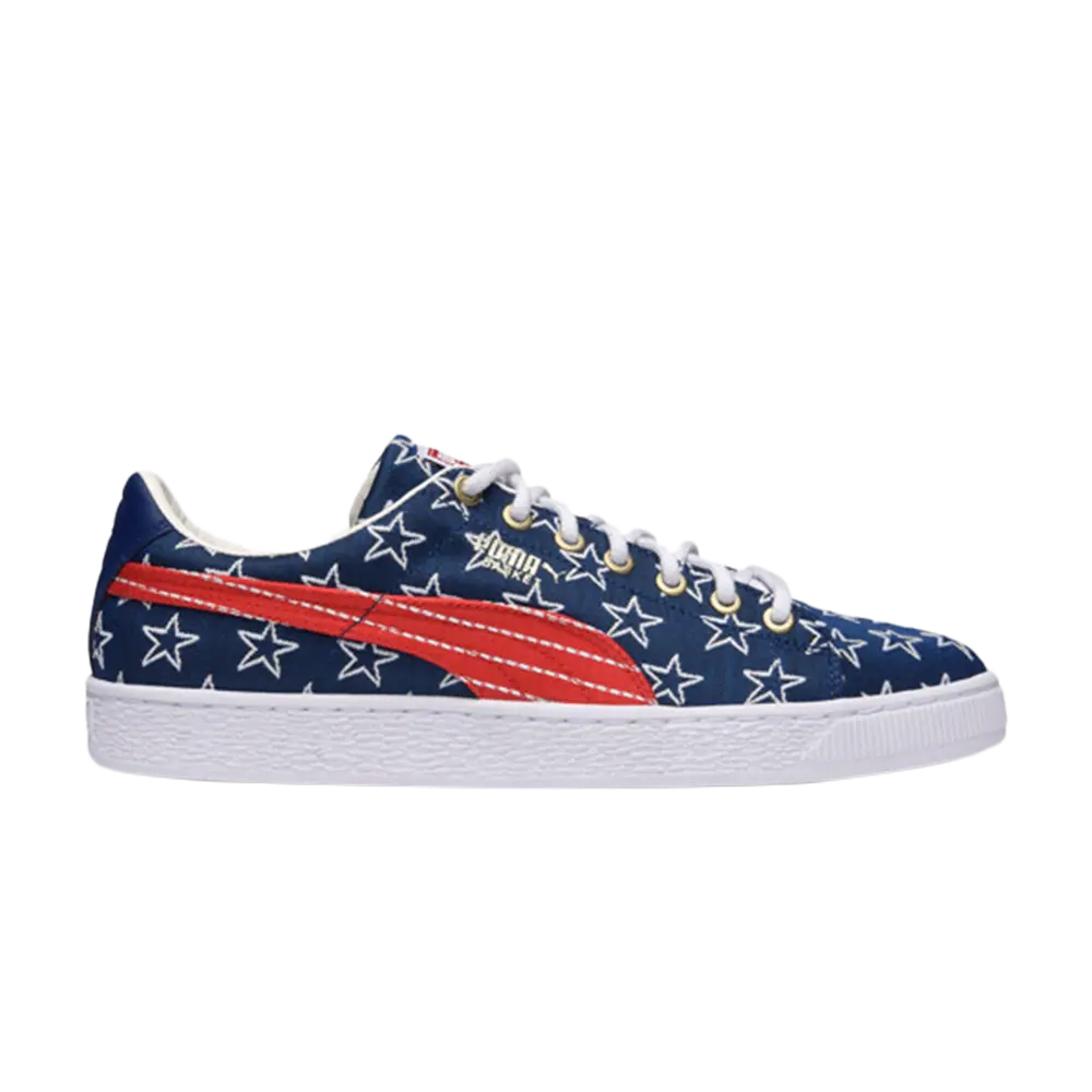 Puma выпустила набор кроссовок Basket Classic «4th Of июля» в июне 2017 года, как раз ко Дню независимости. Несоответствующая пара дебютирует с комплиментарными узорами в виде звезд и полос, напечатанными на текстильном верхе. Белые шнурки обеспечивают надежную посадку, а блестящие люверсы придают нотку привлекательности этой идеальной красно-бело-синей повседневной обуви. Фирменный знак Puma на язычке, пятке и полоске добавляет акцент, а белая резиновая межподошва и подошва завершают патриотичный образ.