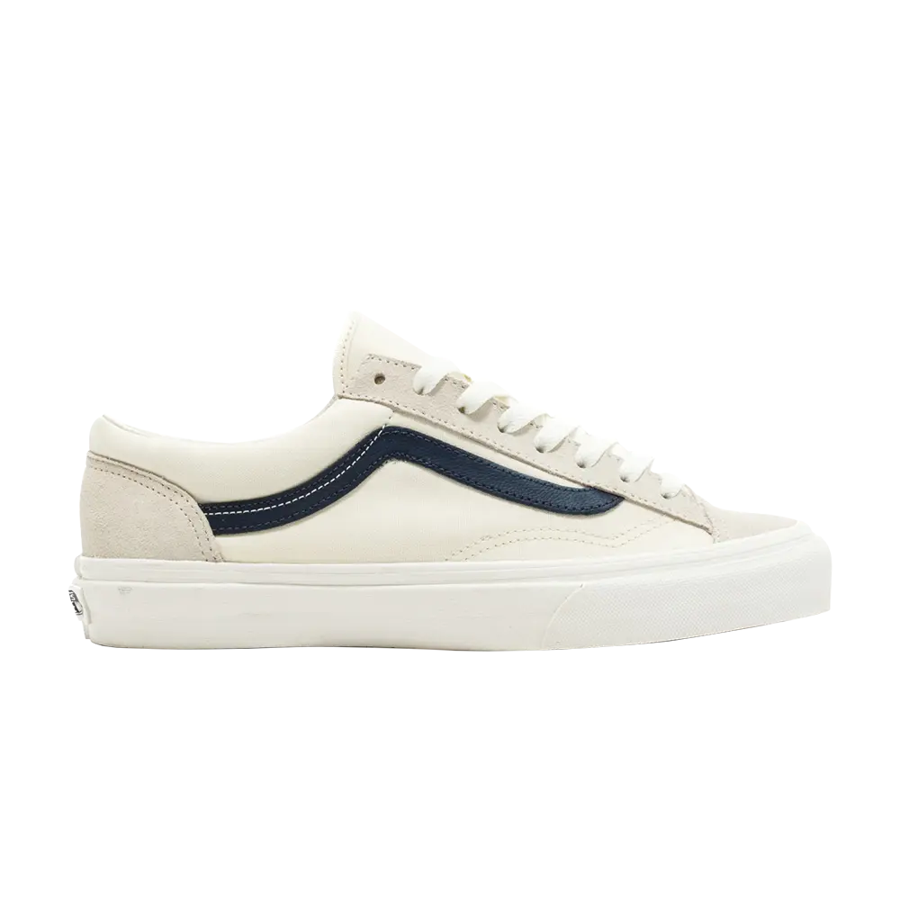 Vans Style 36 дебютировали в 1977 году и превратились в силуэт Old Skool. Это была первая обувь Vans с полосками в стиле джаз на боковых панелях — деталь, вдохновленная рисунками соучредителя Пола Ван Дорена. Эта модель возрождает оригинальные линии дизайна модели 1978 года, включая оригинальный рисунок строчки и усиленный носок. Эта цветовая гамма включает верх из канвы Marshmallow с джазовой полоской Dress Blues и замшу Marshmallow на носке, люверсах и пятке. Обувь также оснащена межподошвой из вулканизированной резины и классической вафельной подошвой.
