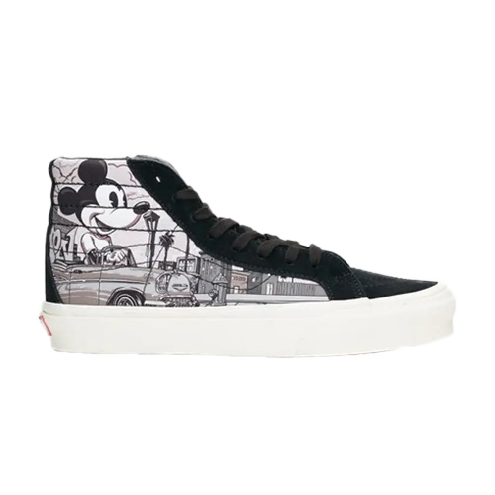 Легендарный татуировщик из Лос-Анджелеса Марк Мачадо был одним из четырех художников, выбранных в 2018 году для сотрудничества с Vans для редизайна классических кроссовок Vans в честь 90-летия Микки Мауса. Кроссовки Disney x Mark Machado x Sk8-Hi имеют монохромную холщовую панель, покрытую характерным эскизом, изображающим Микки Мауса за рулем старинного автомобиля, проезжающего по старому району Лос-Анджелеса. Замшевые вставки покрывают носок, горловину и пятку, а логотип Off The Wall на бампере придает красный оттенок пятке.