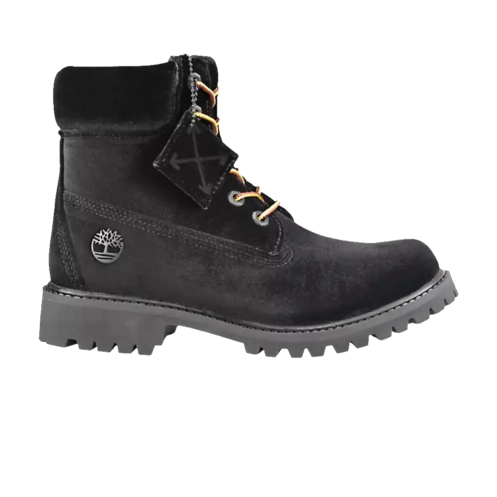 Компания Timberland наняла знаменитого дизайнера Вирджила Абло для обновления своего классического силуэта 6 Inch для коллекции из четырех кроссовок, выпущенной в декабре 2017 года. В ботинках Off-White x Wmns 6 Inch Water «Black» классический нубук бренда заменен на мягкий бархатный верх. Тональный внешний вид подчеркнут двухцветными шнурками и фирменной красной биркой Off-White. Утеплитель PrimaLoft и подошва Vibram защищают и обеспечивают комфорт женской обуви.