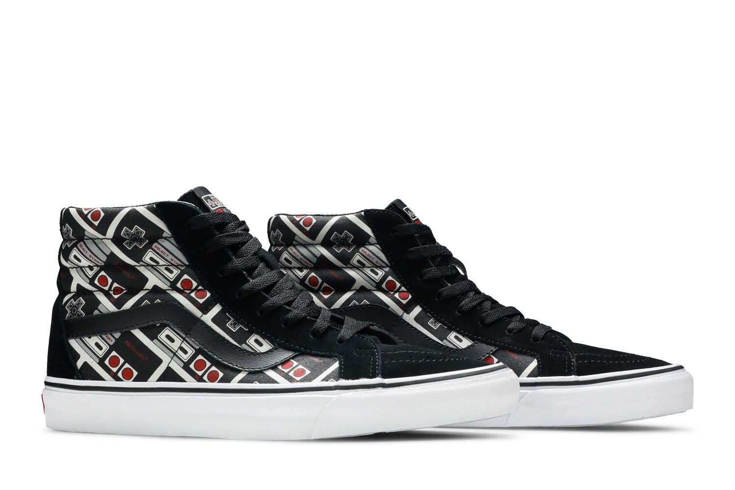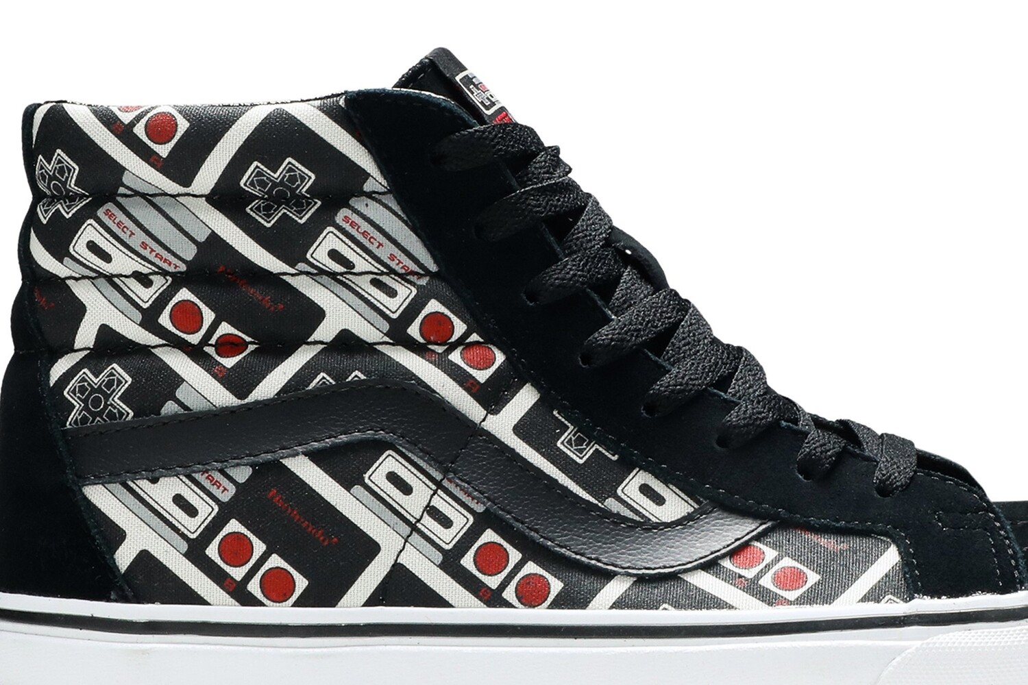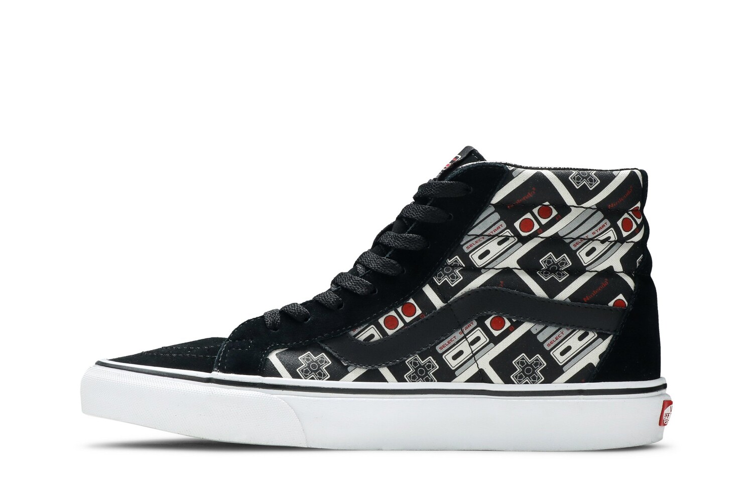 Переиздание Nintendo x Sk8-Hi «Controller» может похвастаться верхом из парусины со сплошным принтом контроллера от первой домашней консоли Nintendo, выпущенной за пределами Японии, Nintendo Entertainment System (NES). Дизайн дополняется мягким воротником, черной кожаной джазовой полоской и черной замшей на носке, проушинах и пятке. Высокие кроссовки установлены на белой вулканизированной межподошве, а на черной вафельной подошве нанесена надпись «Game Over!».