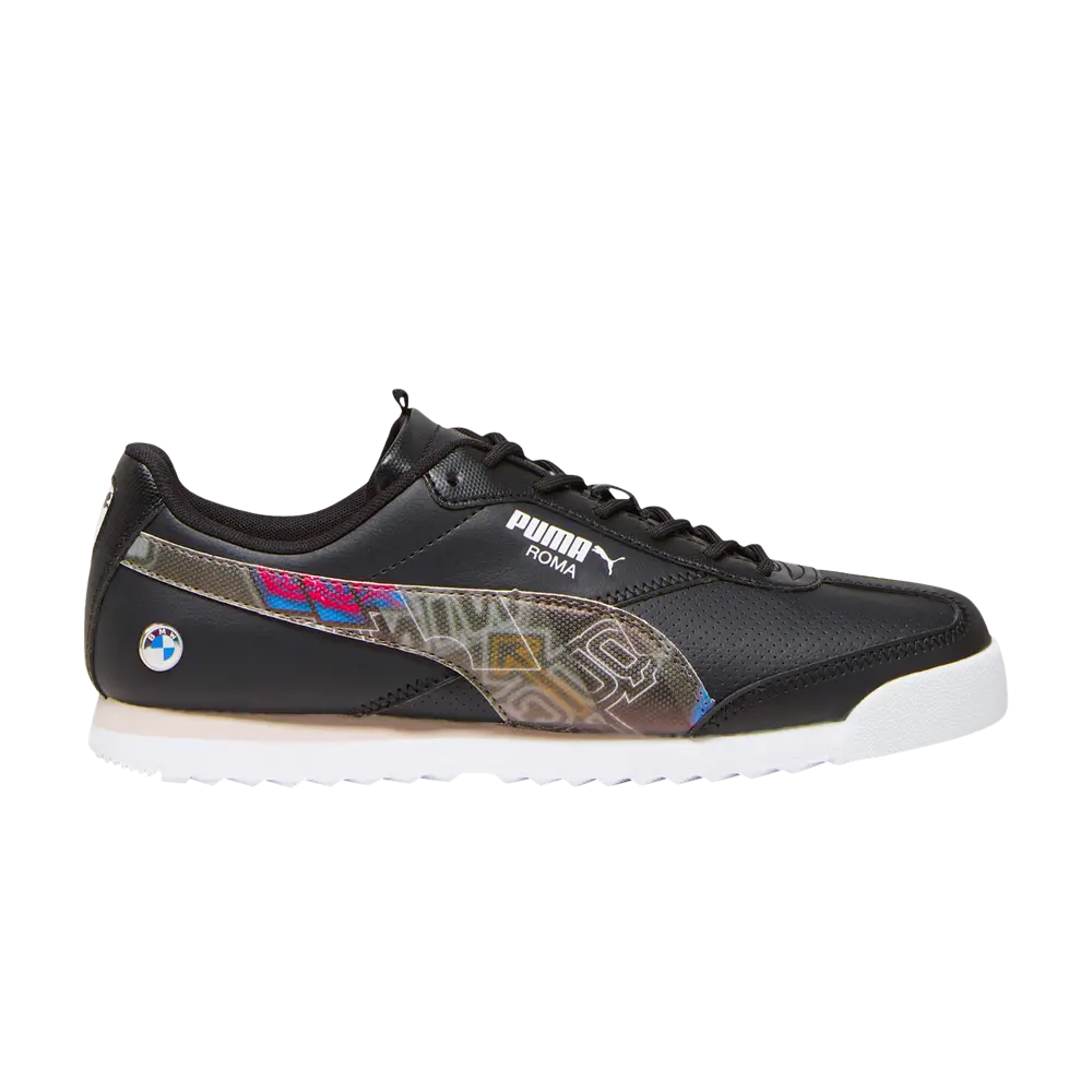 BMW Motorsport x PUMA Roma Via «BMW DNA» представляет собой вдохновленную автоспортом интерпретацию архивной модели. Верх выполнен из черной синтетической кожи, украшен узорчатой полупрозрачной полосой Formstrip и значком BMW на пятке сбоку. На противоположной стороне отпечатан логотип BMW Motorsport. Низкий силуэт дополнен легкой межподошвой из ЭВА с белоснежной отделкой. Под ногами резиновая подошва с модифицированным протектором в виде елочки для превосходного сцепления.