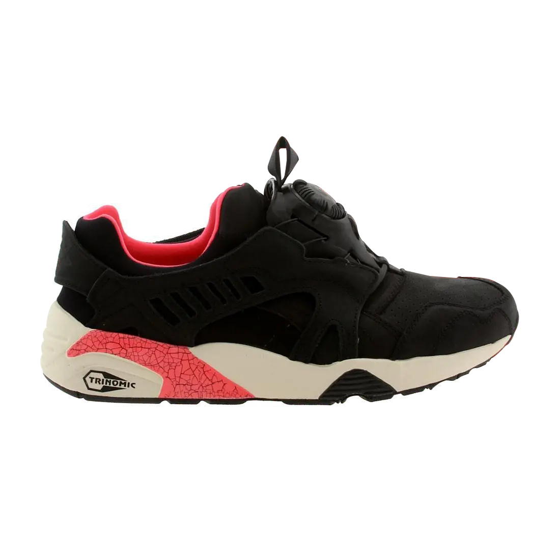 Система Disc начала 90-х годов от Puma представляла собой футуристический намек на системы самозавязывания застежек: пользователям нужно было только повернуть ручку для плотного прилегания. Пару лет спустя Puma отказалась от дизайна — до 2012 года, когда коллаборация с нью-йоркским дизайнером уличной одежды Ронни Файгом вернула Disc с OG Disc Blaze. Мужские кроссовки Disc Blaze Crackle сохраняют силуэт благодаря межподошве из пеноматериала Trinomic и сочетаются с верхом из премиальной черной замши и яркой полосой розовой неоновой потрескавшейся краски на пятке.