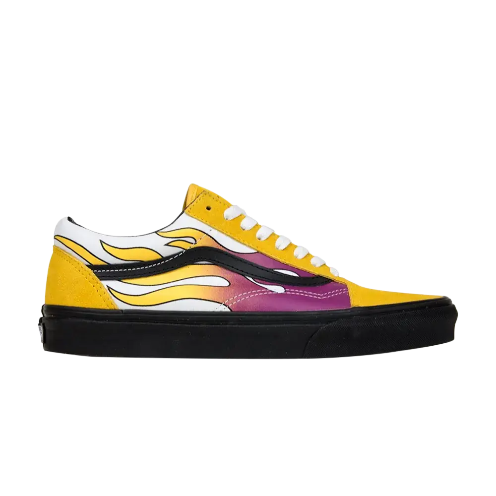 Классическая модель Old Skool от Vans, первая модель с культовой боковой полосой, отличается огненной графикой в версии Flame 2018 года. Модель выполнена из ярко-желтой замши с градиентным принтом на пятке, спускающимся по парусиновой вставке в средней части стопы. Фирменная резиновая вафельная подошва и надпись Off the Wall дополняют классический образ.