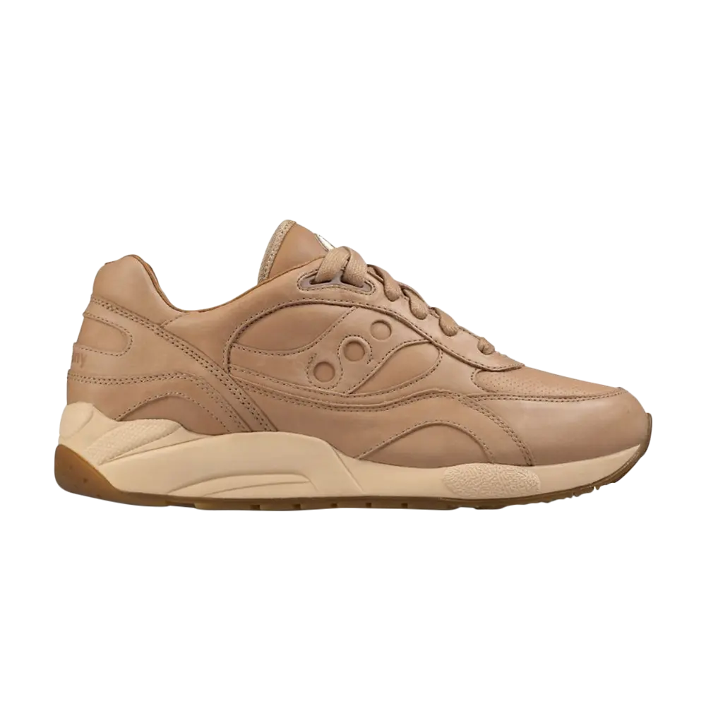 Saucony G9 Shadow 6000 изначально появились в конце 80-х как фирменные кроссовки для бега. Эта версия Veg Tan, переизданная в мае 2017 года, отражает влияние уличного стиля в макияже из натуральной кожи, подчеркнутом металлическим медальоном с логотипом на вышивке на язычке и пятке. Деконструированные линии и окна в средней части стопы создают визуальную глубину. Рельефная межподошва и резиновая подошва придают модели олдскульный вид.