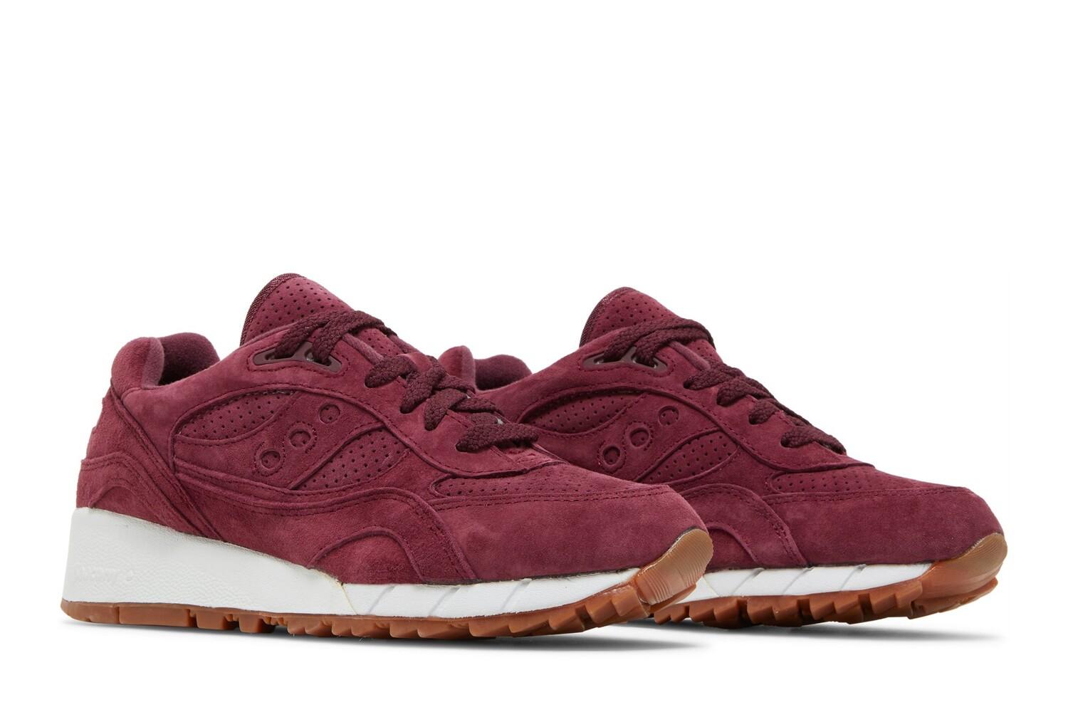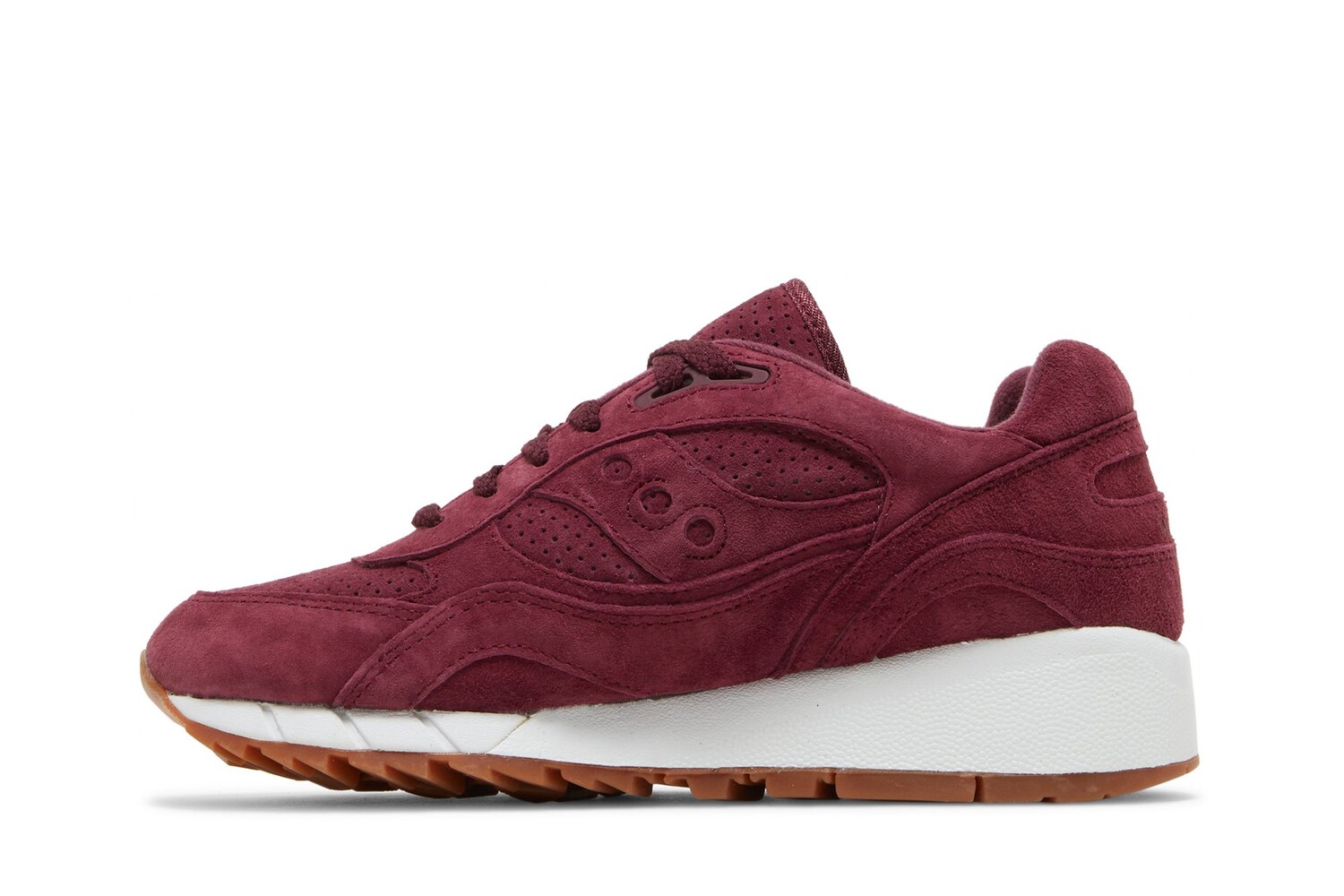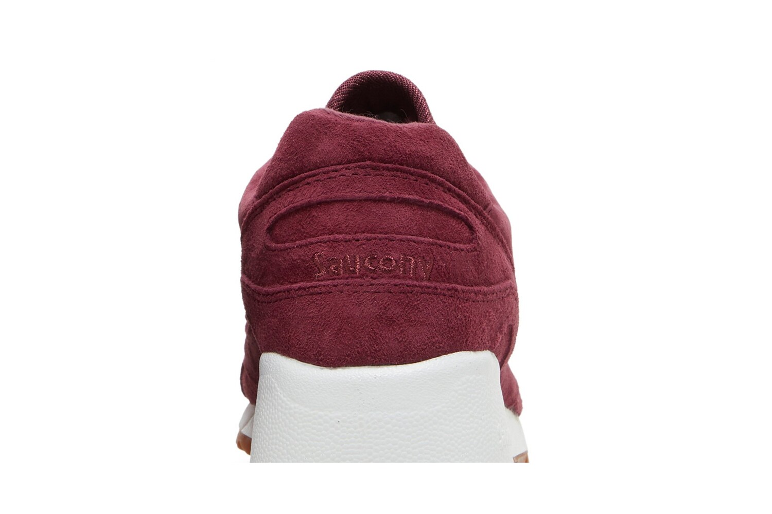 Этот бордовый оттенок Saucony Shadow 6000 был выпущен в апреле 2016 года как эксклюзив Packer Shoes. Кроссовки в стиле ретро имеют полностью замшевый верх с перфорированной отделкой на носке, боковой панели и язычке, без привычной нашивки с логотипом. Текстурированная, четкая белая межподошва уступает место резиновой подошве, усиленной треугольными выступами для дополнительного сцепления и долговечности.