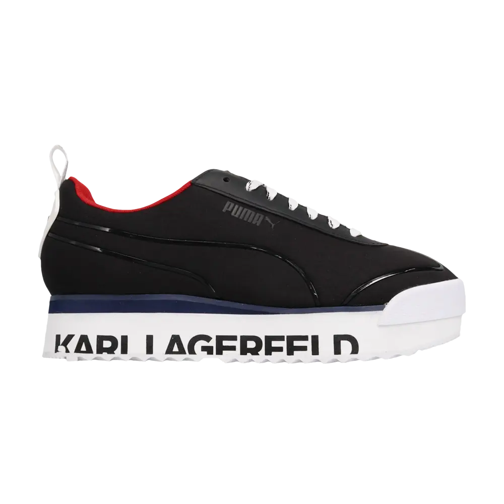 Выпущенная в октябре 2019 года модель Wmns Roma Amor Karl из капсульной коллекции Karl Lagerfeld x Puma сочетает в себе модную чувственность и классику спортивной одежды. Черный неопреновый верх кроссовок украшен глянцевыми деталями Formstrip, обрамленным носком и полосатыми шнурками. Красная стелька и значок на пятке, закрывающий фирменный язычок, придают модели роскошную современность. На платформе EVA напечатаны жирные буквы логотипа.