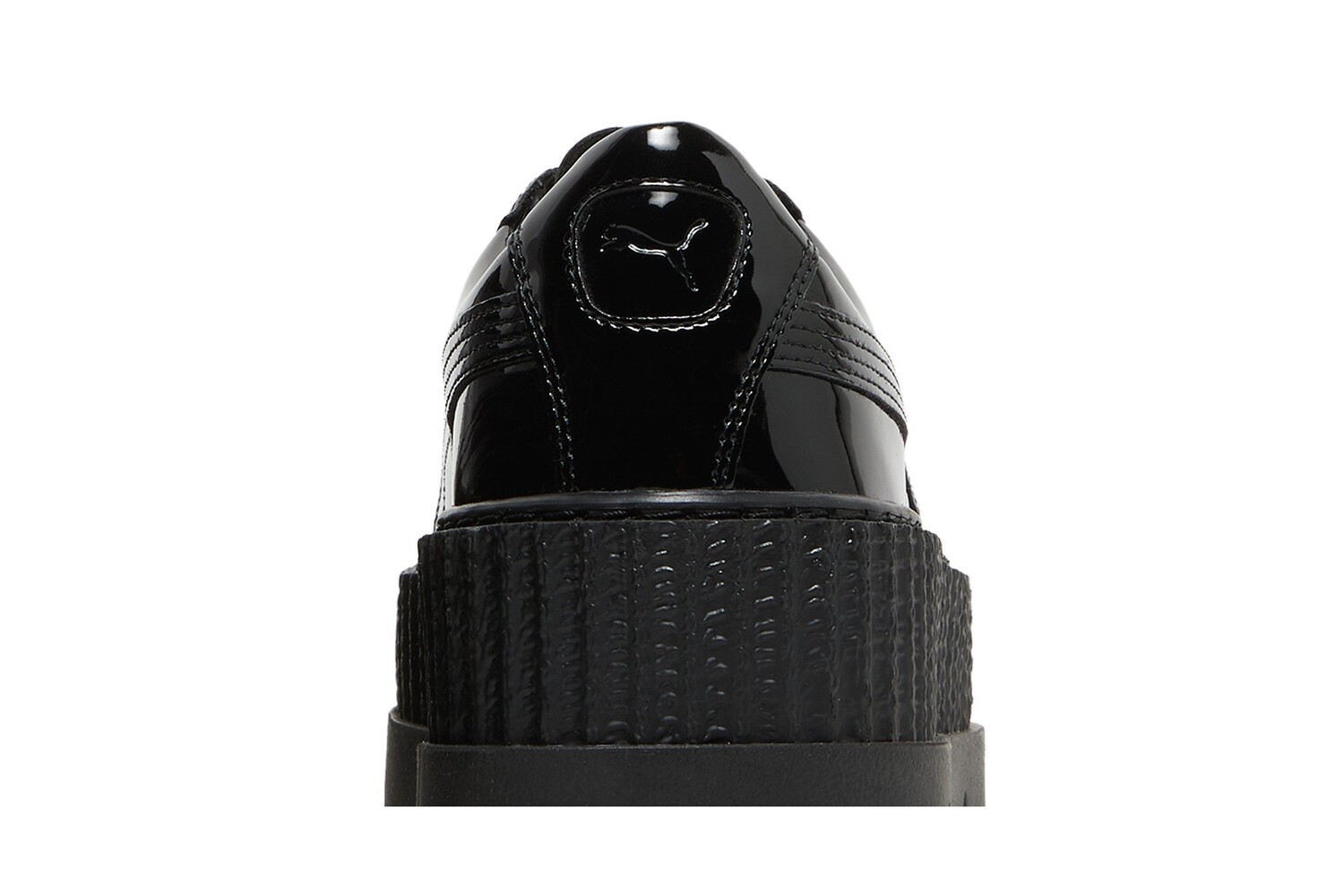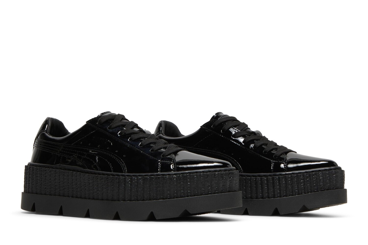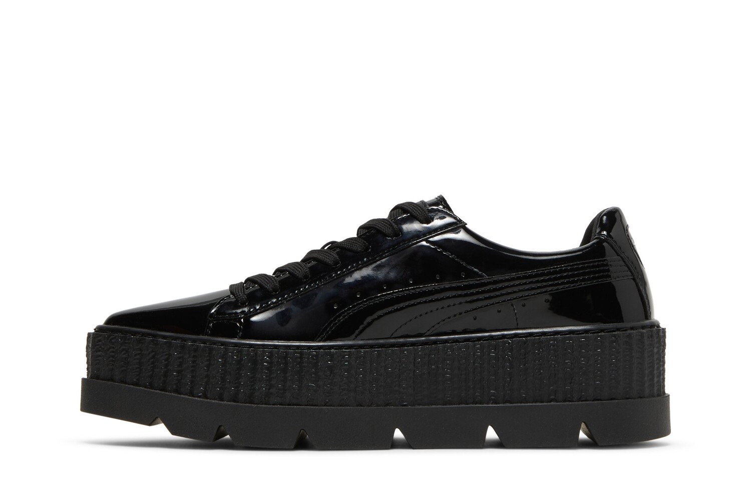 Эта тройная черная версия Pointy Creeper, являющаяся частью коллекции Fenty Puma by Rihanna, выпущенной в октябре 2017 года, выделяется черной глянцевой лакированной кожей. Модель опирается на толстую резиновую межподошву на платформе и зубчатую подошву. Обратите внимание на тисненые логотипы Puma и стельки совместного бренда.