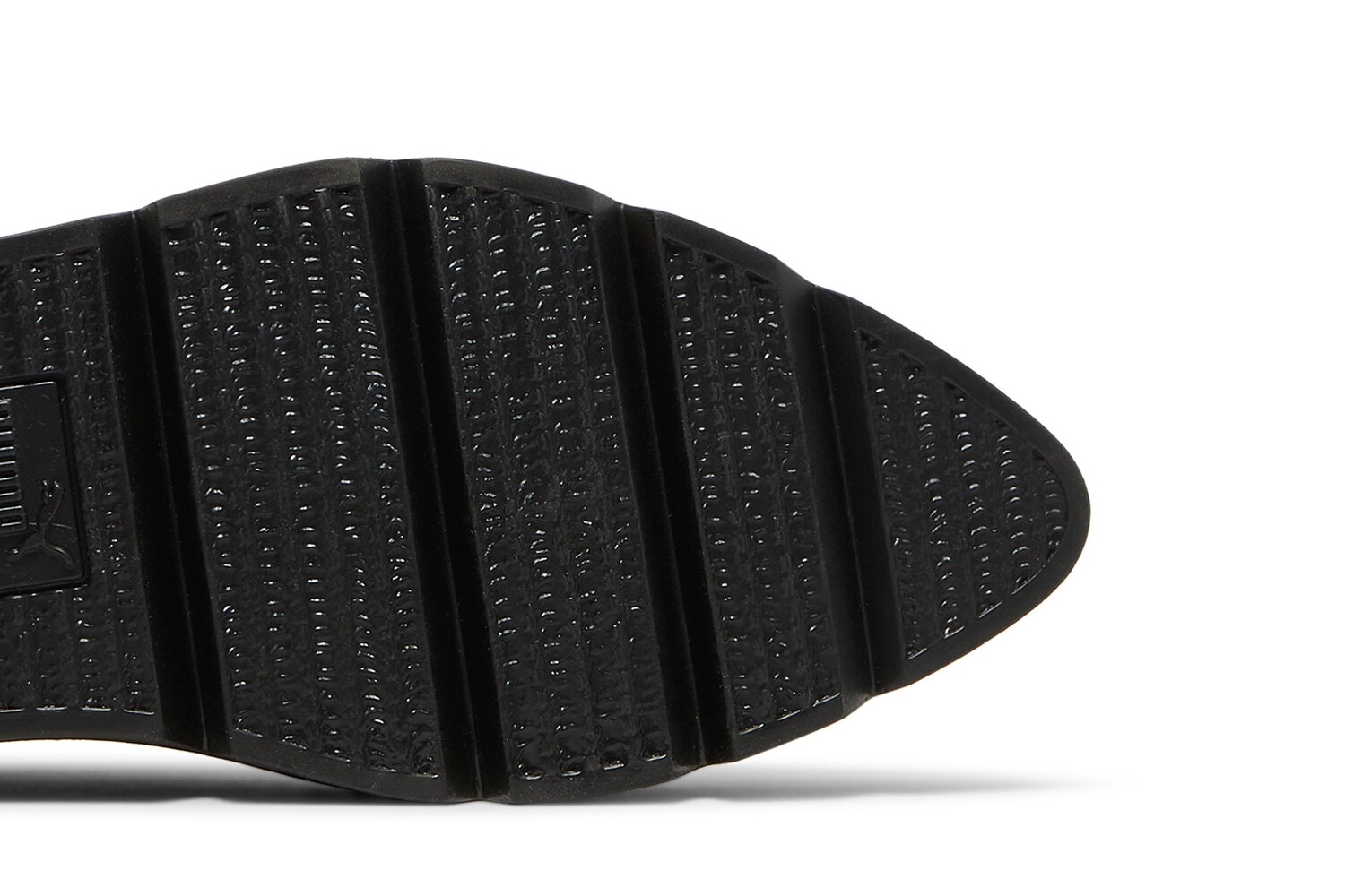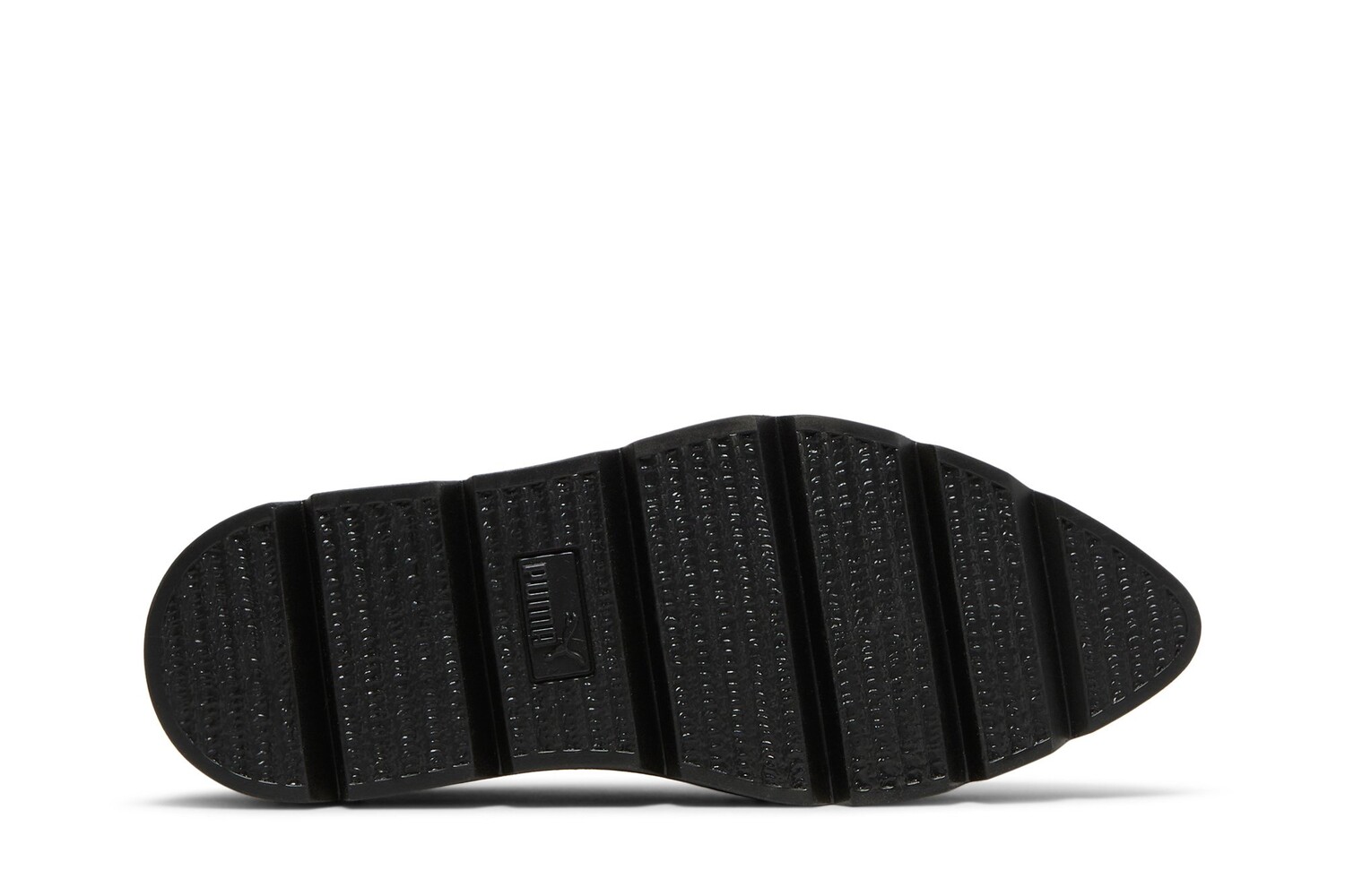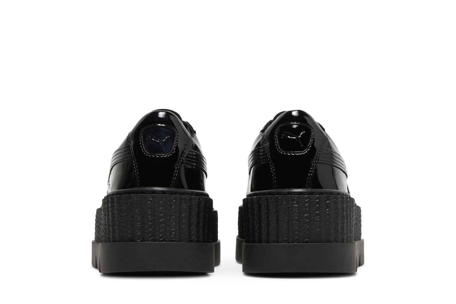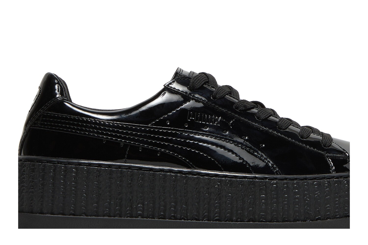 Эта тройная черная версия Pointy Creeper, являющаяся частью коллекции Fenty Puma by Rihanna, выпущенной в октябре 2017 года, выделяется черной глянцевой лакированной кожей. Модель опирается на толстую резиновую межподошву на платформе и зубчатую подошву. Обратите внимание на тисненые логотипы Puma и стельки совместного бренда.