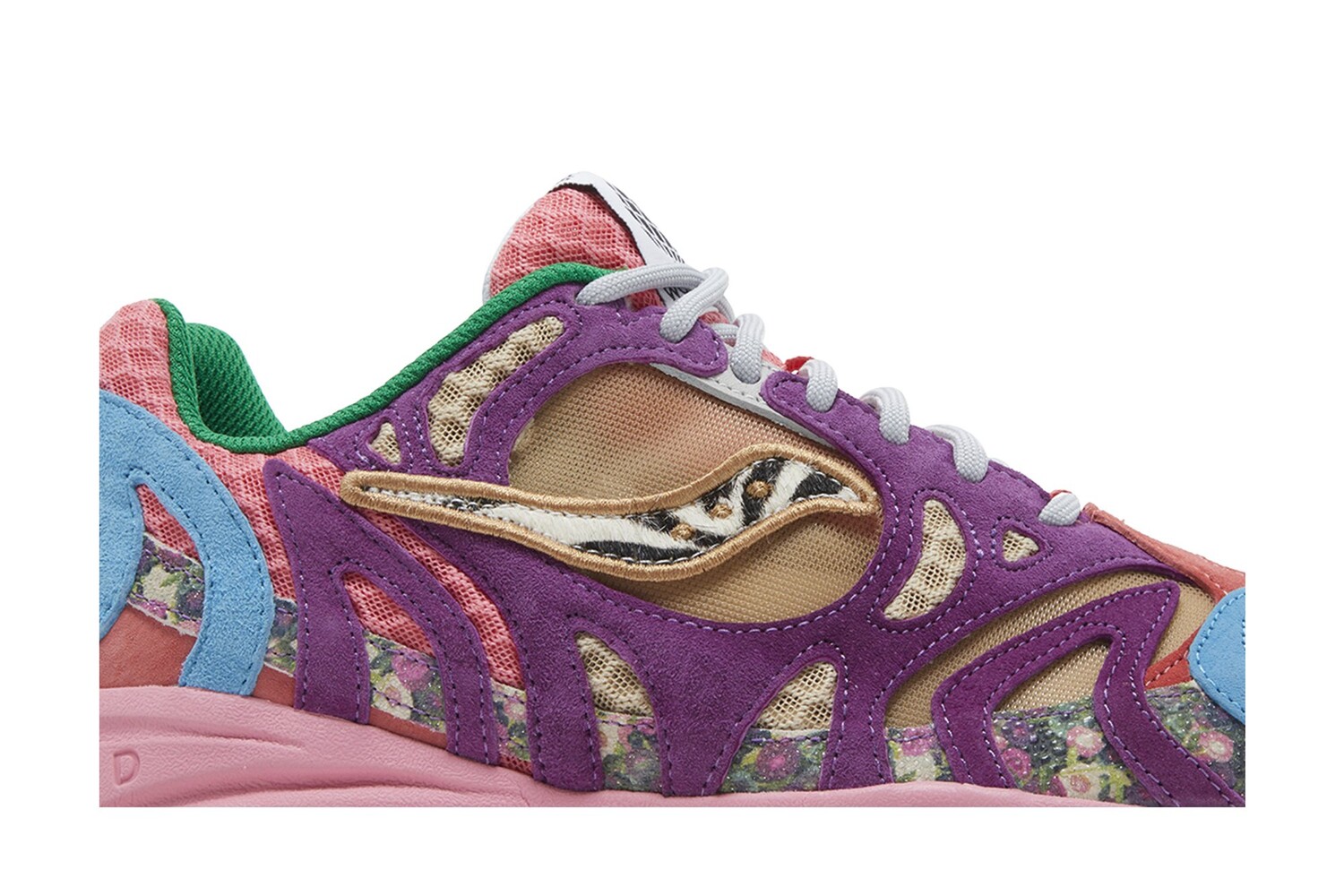 Jae Tips x Saucony Grid Azura 2000 «Remember Who Fronted» — это дебютная совместная работа, выполненная в буйном сочетании цветов. Верх из смешанного материала сочетает в себе бежевую сетчатую основу с замшевыми накладками ярких фиолетовых, бирюзовых и красных оттенков. Многоцветный цветочный принт украшает замшевый брызговик, а заднюю часть пятки украшает черно-белый шахматный принт. Кроссовки расположены на розовой межподошве из ЭВА с надписью «Помни, кто впереди» на средней пятке. Под ногами полупрозрачная резиновая подошва с треугольными выступами для превосходного сцепления.
