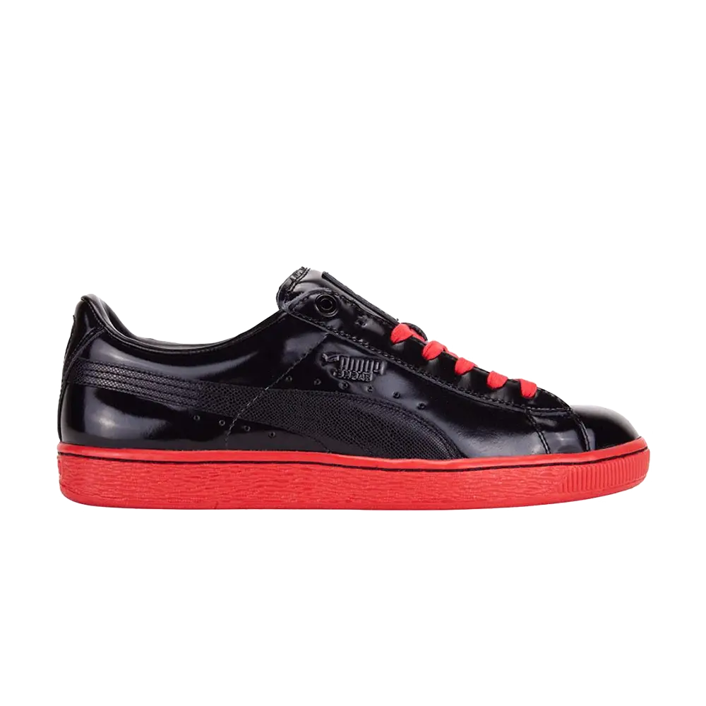 Кроссовки Meek Mill x Basket Patent «Black Red» с низким верхом — это половина дуэта обуви Patent Pack, появившегося в результате второго сотрудничества рэпера Meek Mill с Puma в 2015 году. Первой была яркая модель 24K White. Золотой пакет. Изящный силуэт имеет черный лакированный верх с текстурированной планкой и тисненым логотипом Puma. Акцент сделан на ярких красных шнурках и красной резиновой подошве со звездообразным рисунком.