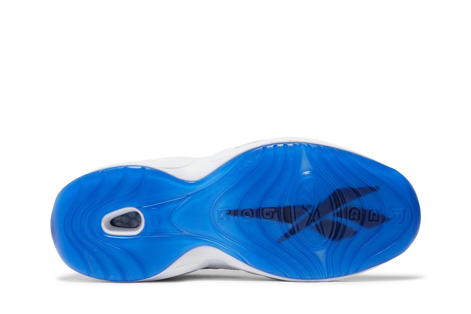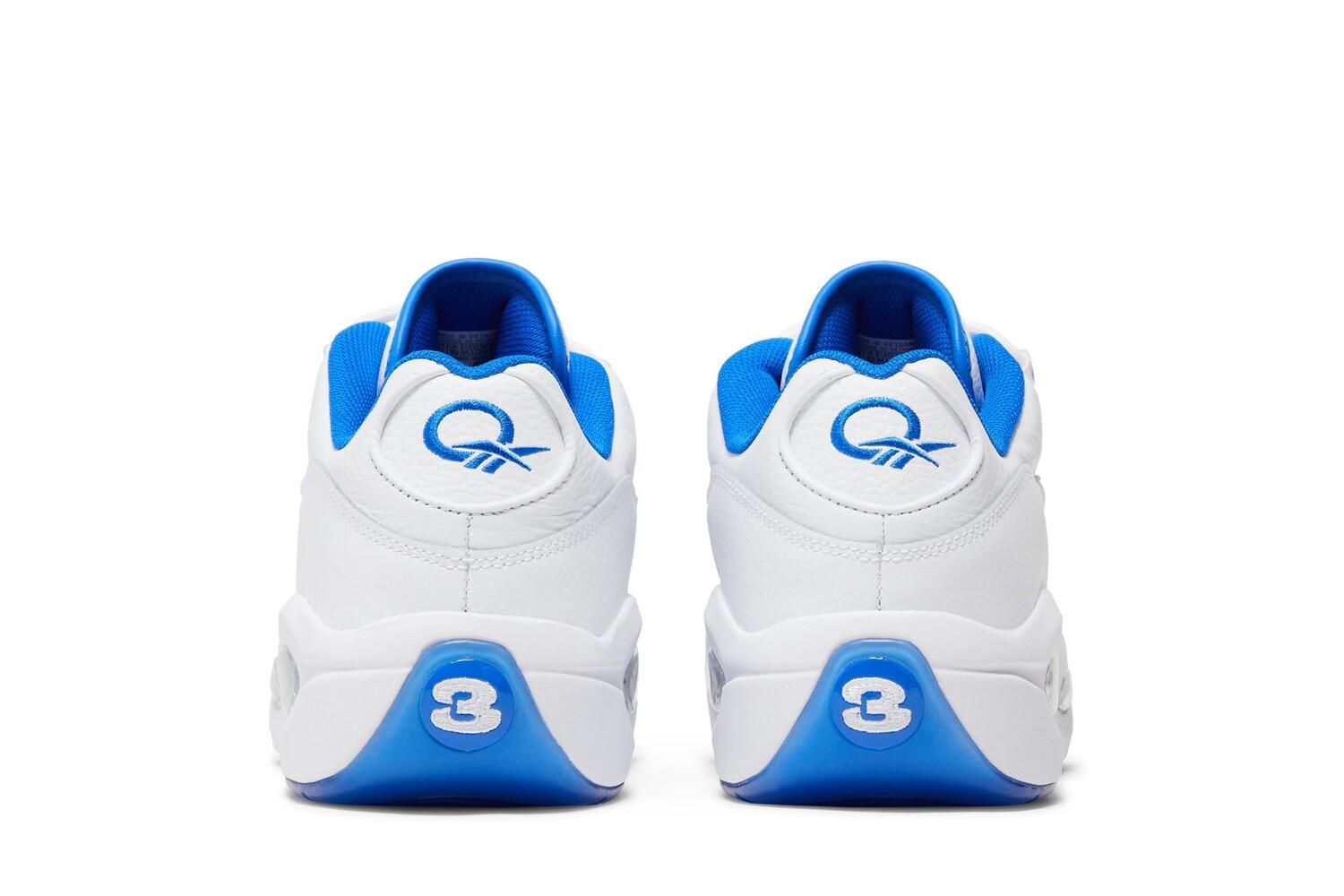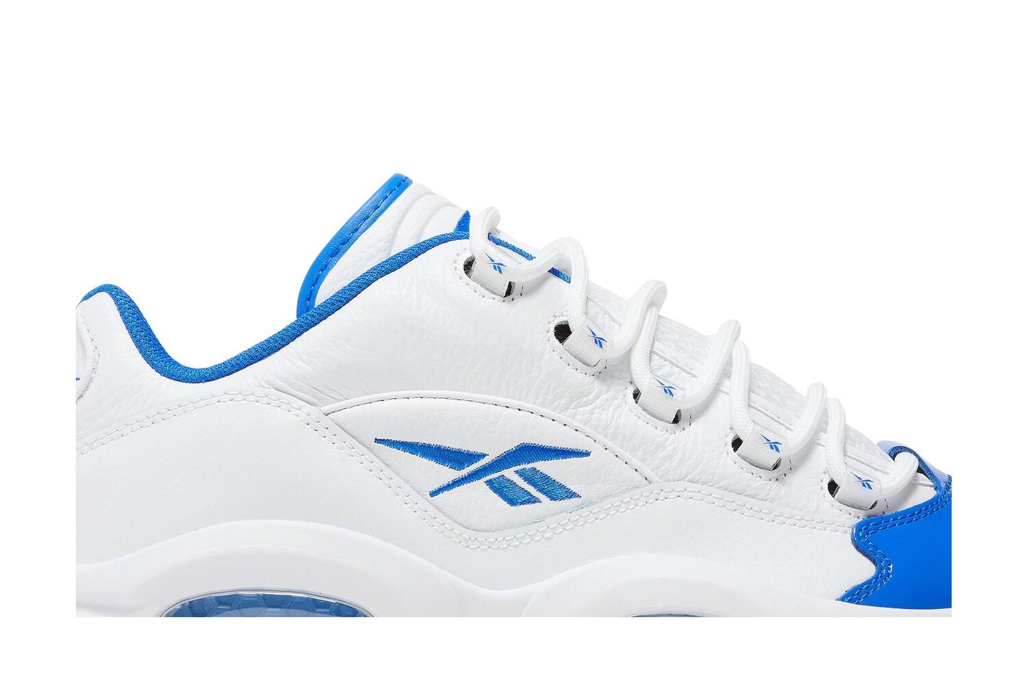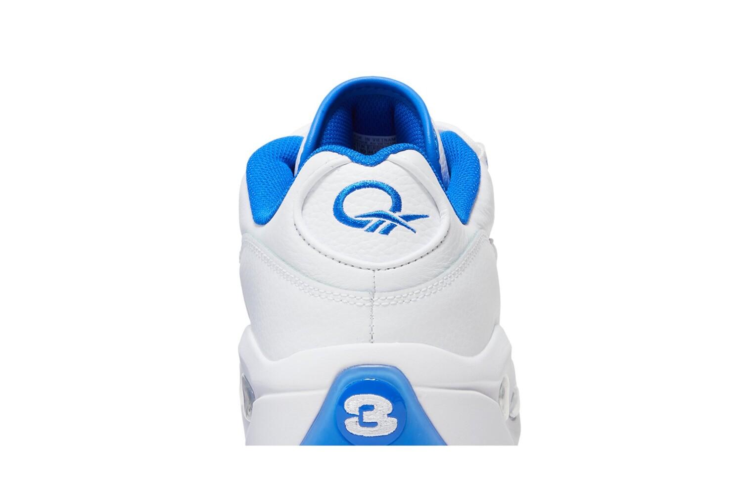 Reebok Вопрос Low «White Electric Cobalt» имеет двухцветную цветовую гамму, вдохновленную OG «Blue Toe» Вопрос. Дебютные фирменные туфли Аллена Айверсона с низким верхом имеют верх из белой кожи и лакированный носок с контрастной отделкой королевского синего цвета. Яркий оттенок повторяется на внутренней подкладке, а также на логотипах Vector и вопрос, которые украшают боковую панель и пятку обуви. Кроссовки установлены на скульптурной межподошве из ЭВА, снабженной видимой амортизацией Hexalite и поддерживаемой полупрозрачной синей резиновой подошвой.